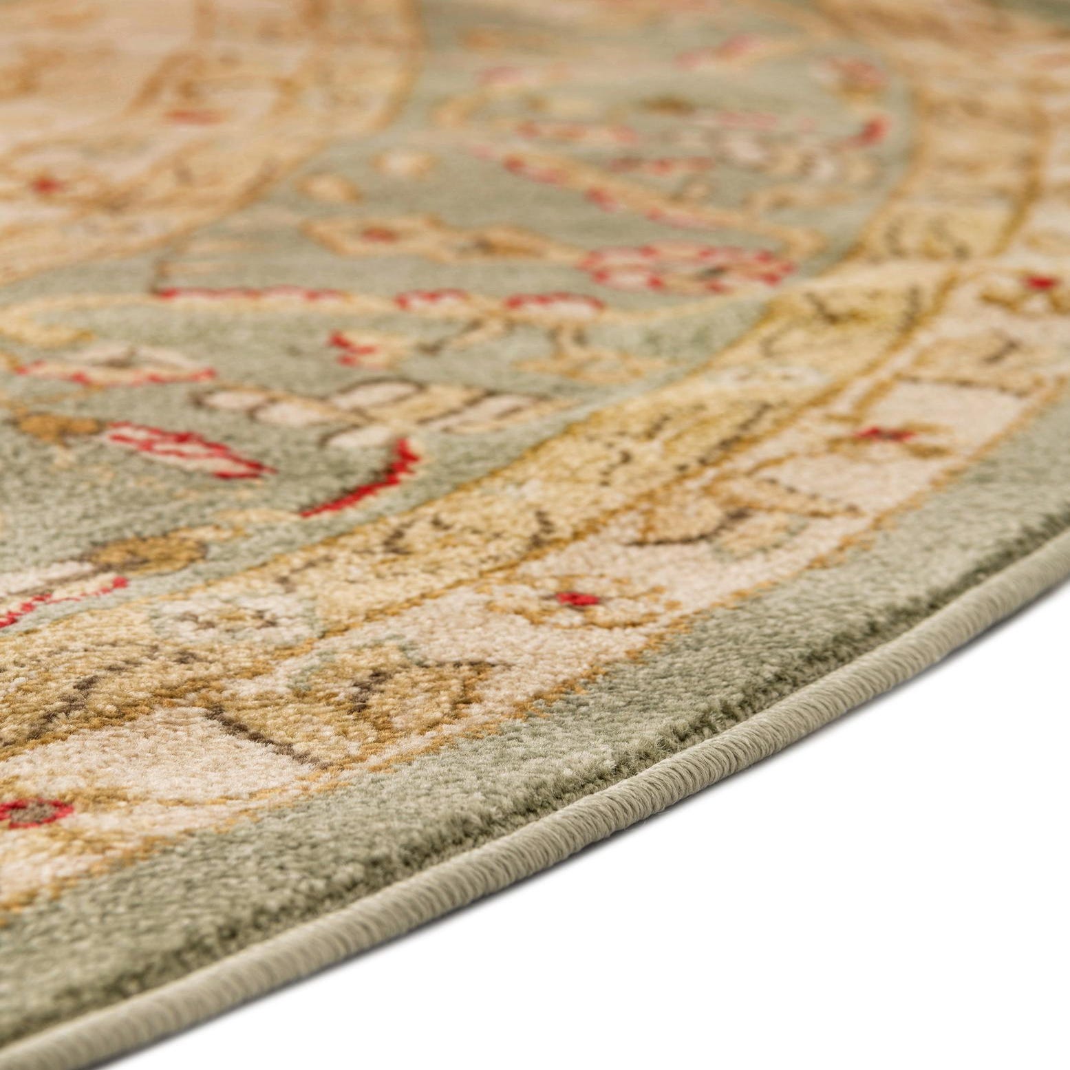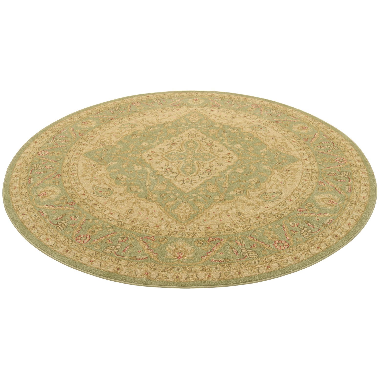 The Chelsea Collection offers a harmonious blend of traditional design and contemporary craftsmanship. This particular 6 Ft Round rug showcases a central medallion pattern surrounded by intricate florals and scrollwork. The color palette includes a light green background, complemented by cream, beige, red, and light brown accents, creating a soft and versatile appearance.