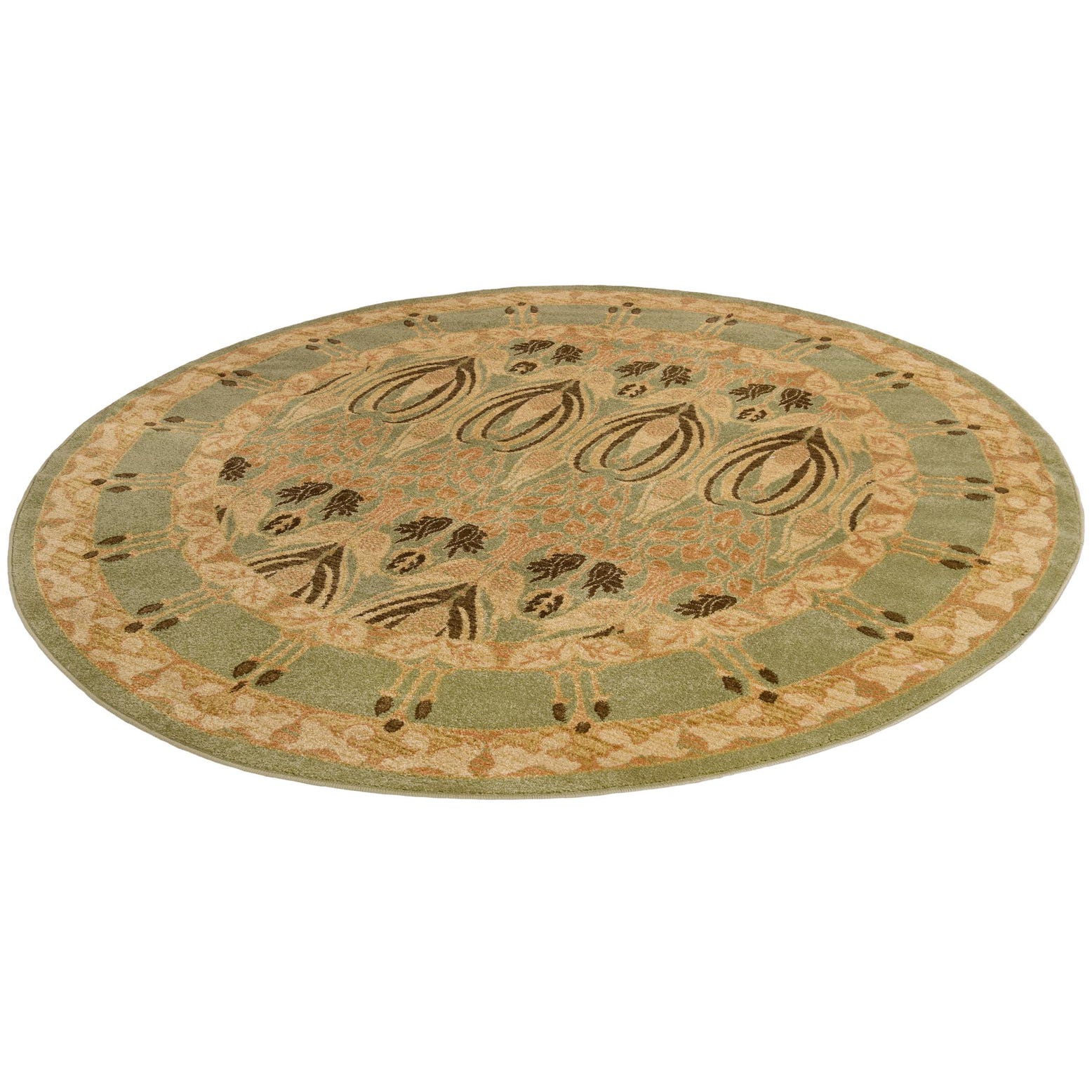 The Chelsea collection features a 6 Ft Round rug machine woven of 100% polypropylene, designed to offer both durability and style. This piece showcases a light green background that effortlessly supports the varied palette of cream, olive, tan, and brown accents. The pattern is a harmonious fusion of traditional motifs and floral elements, creating an elegant and well-balanced design.