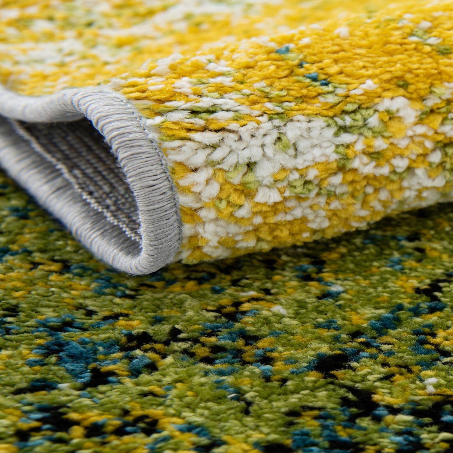 Machine-made from 100% polypropylene, this rug fits well in contemporary and eclectic interiors. Place it beneath a round dining table or center it in a living area to anchor a seating group; it also works nicely in a home office or a bedroom sitting nook. Pair with warm wood tones and brass accents to pick up the yellow and ivory, add navy or denim textiles to echo the blue, or use black metal elements to tie into the darker streaks for a cohesive, modern look.