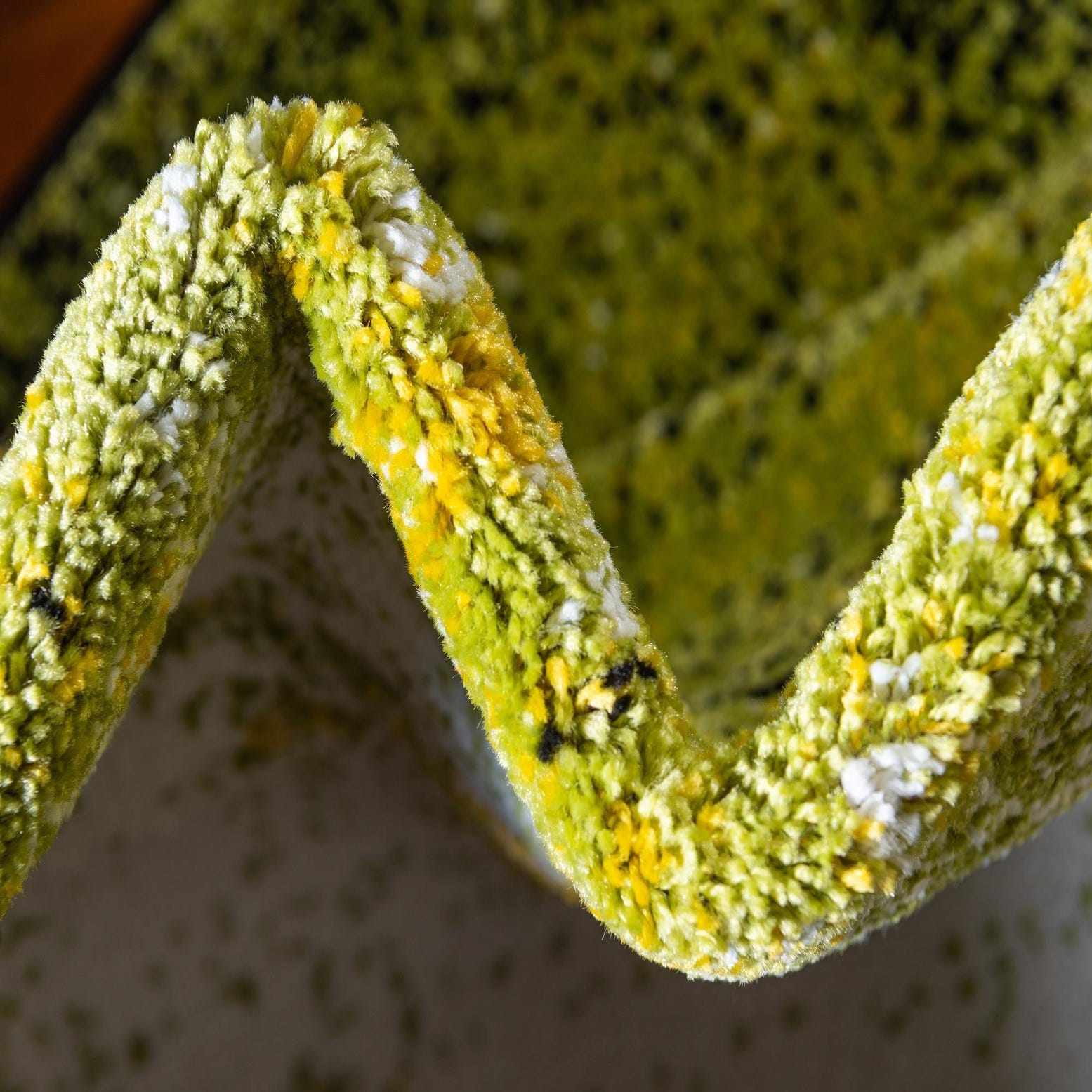 A round rug with a painterly, abstract pattern that feels like a modern art study underfoot. Broad washes of light green form the background, interrupted by textured streaks and dots of black and blue, while ivory and yellow highlights create areas of brightness and contrast. The surface has a low-pile, slightly dense hand typical of machine-made polypropylene — smooth to touch with subtle variations where the pattern intensifies, giving the design a layered, tactile quality.