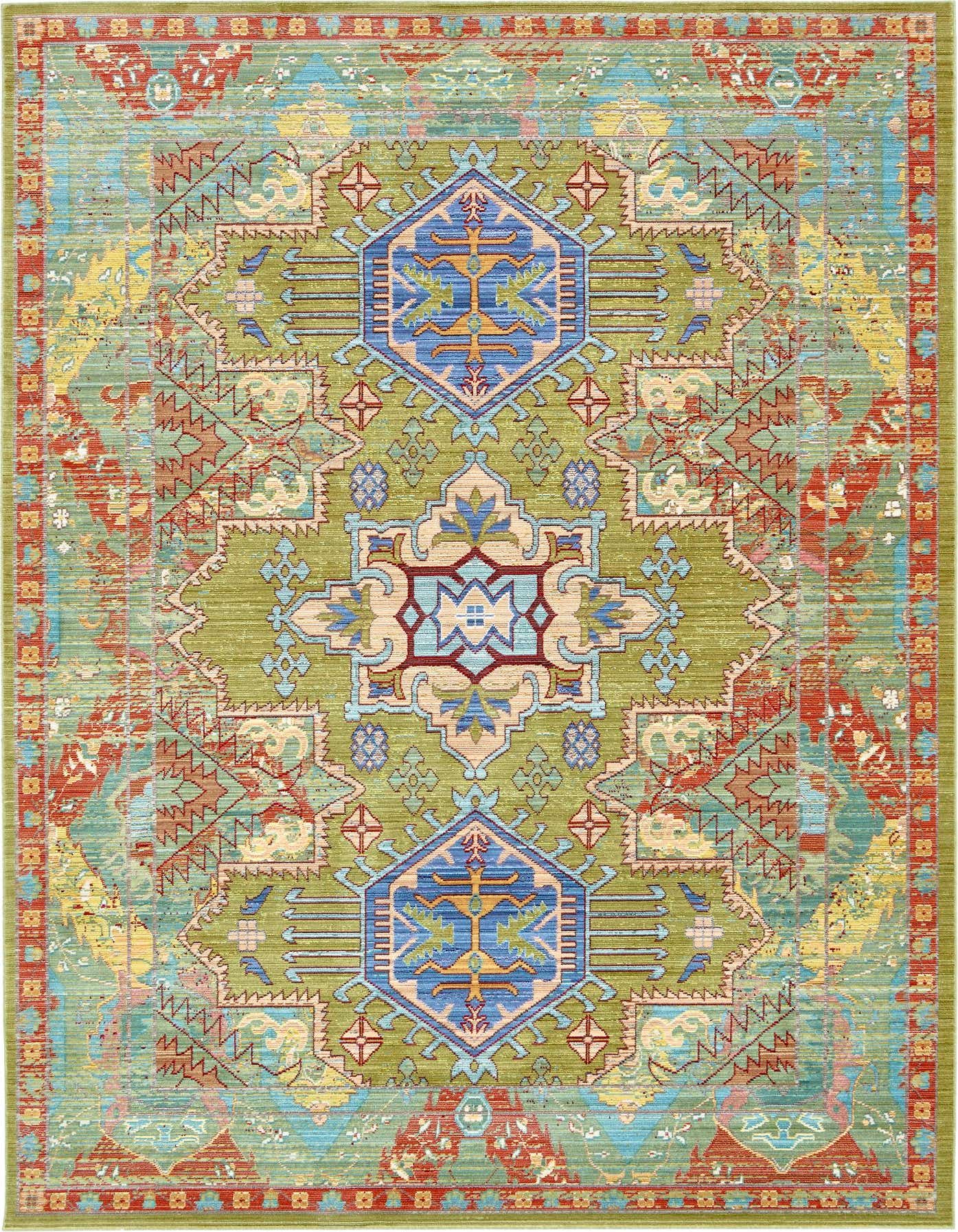 Primary color is Light Green. Colors in this rug include: Light Green, Beige, Blue, Brown, Red, Green.