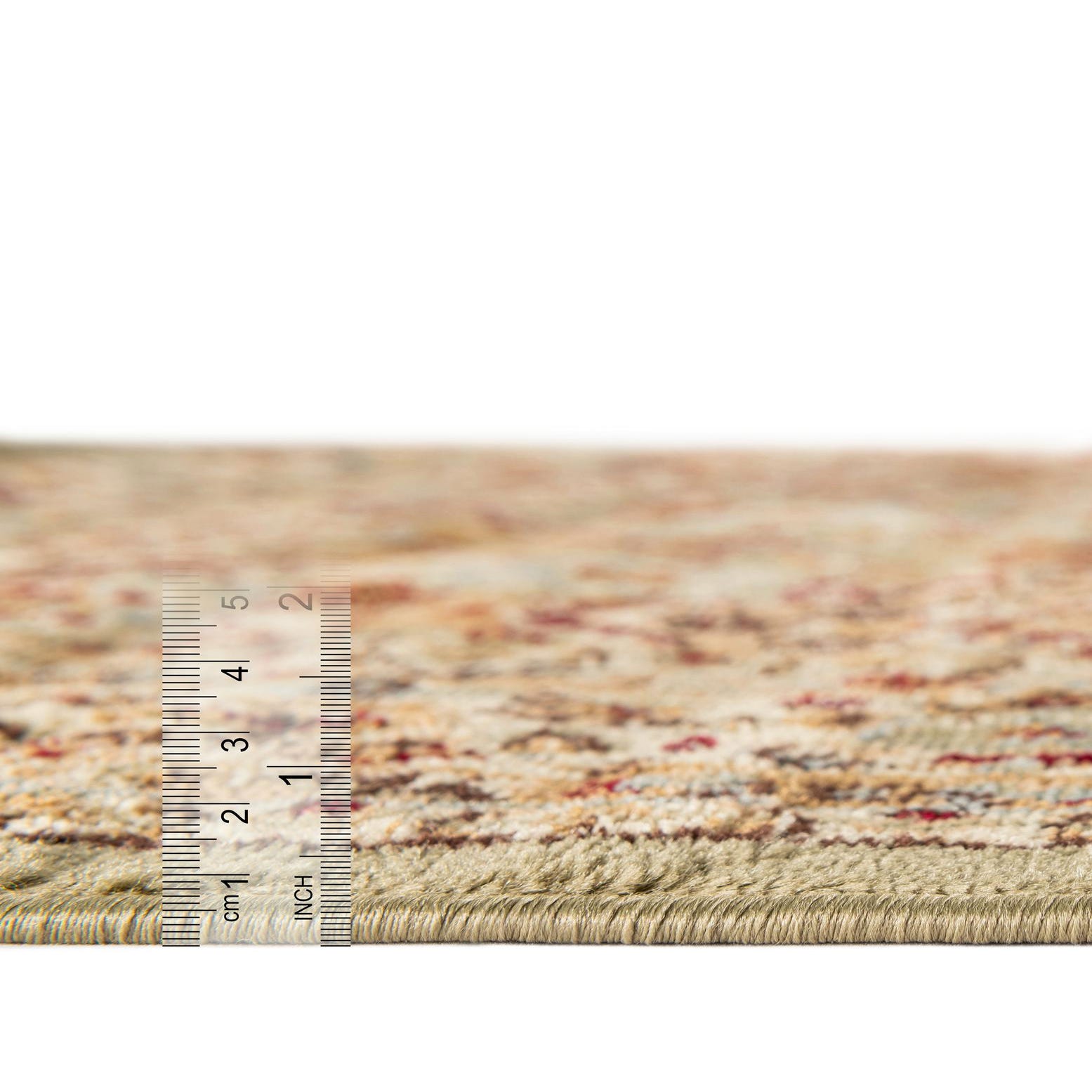This piece works well as a grounding element in a living room beneath a neutral sofa, or layered under a wood dining table where the cream border defines the seating area. It pairs nicely with warm wood finishes, leather or tan upholstery, and cool blue accents for contrast; the red and rust details bring subtle warmth to traditionally styled or transitional interiors. The durable construction makes it a practical choice for everyday rooms that benefit from a classic patterned anchor.