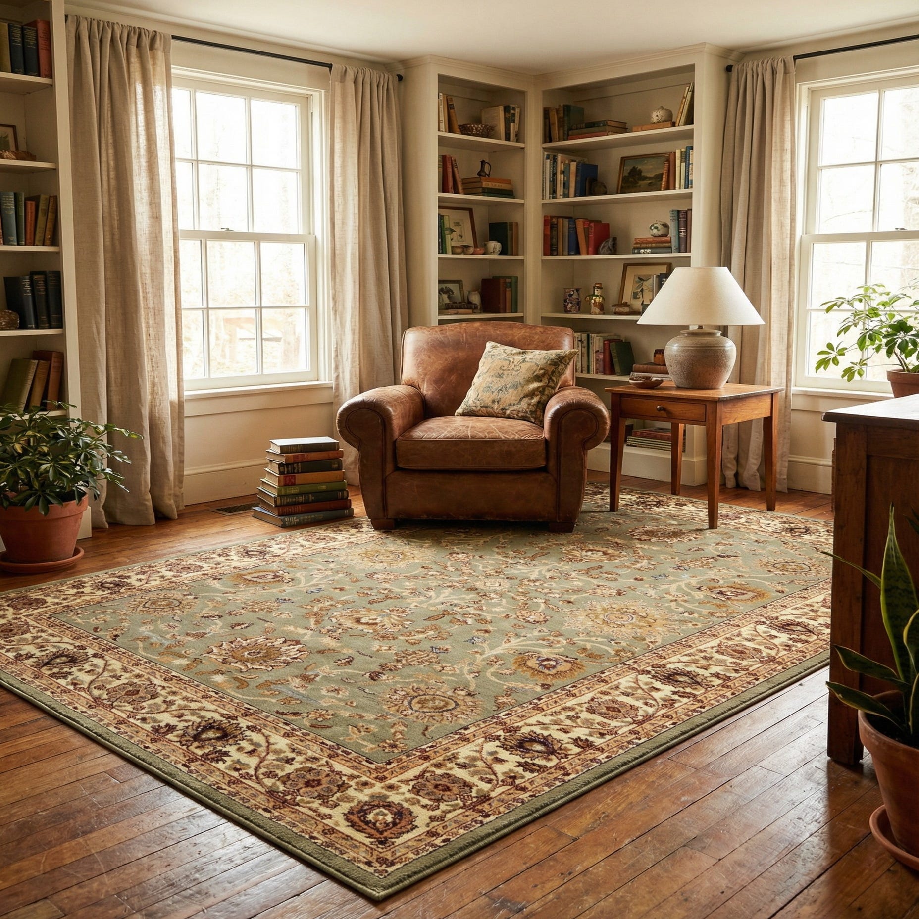 This piece works well under a living room seating group to anchor sofas and a coffee table, beneath a dining table to introduce pattern without overwhelming the space, or layered at the foot of a bed for added color and texture. Pair it with warm-wood furniture, linen or cream upholstery, and brass or antique-finish accents for a traditional or transitional scheme; it also complements botanical or cottage-inspired interiors when combined with woven textiles and soft greens.