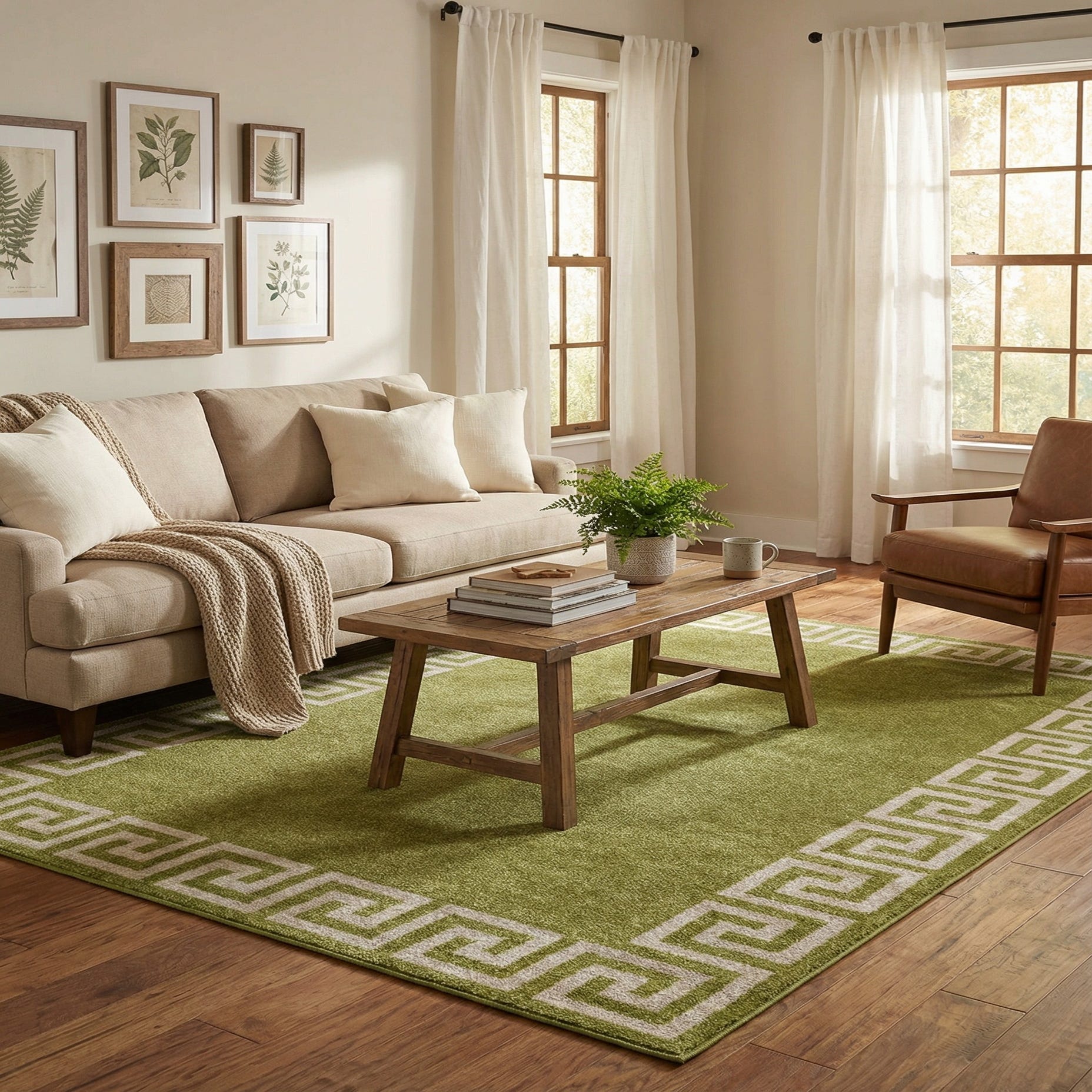 A 7x10 rectangular green area rug with a light beige Greek key border pattern, suitable for a living room.