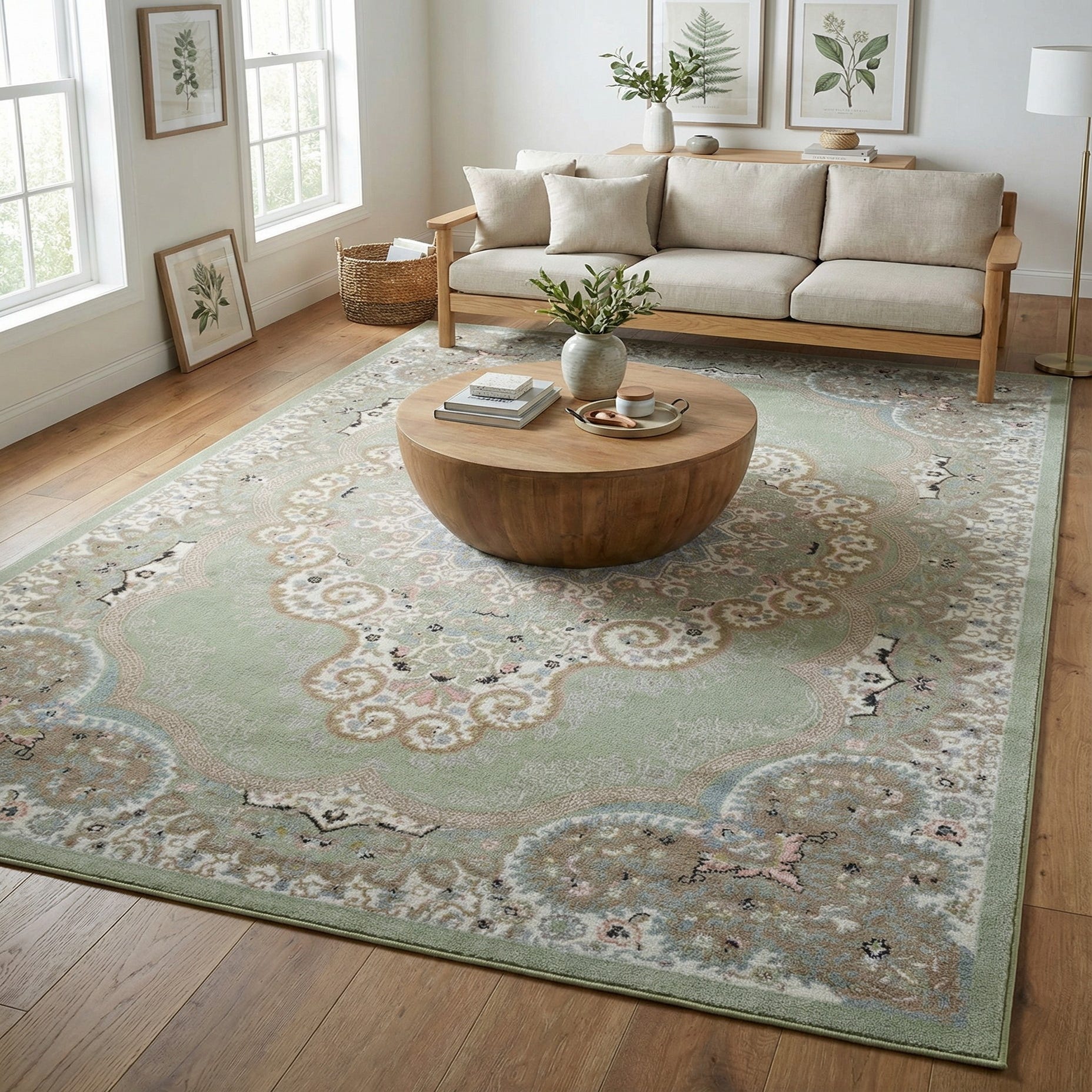 Primary color is Light Green. Colors in this rug include: Light Green, Beige, Ivory, Light Blue, Pink.