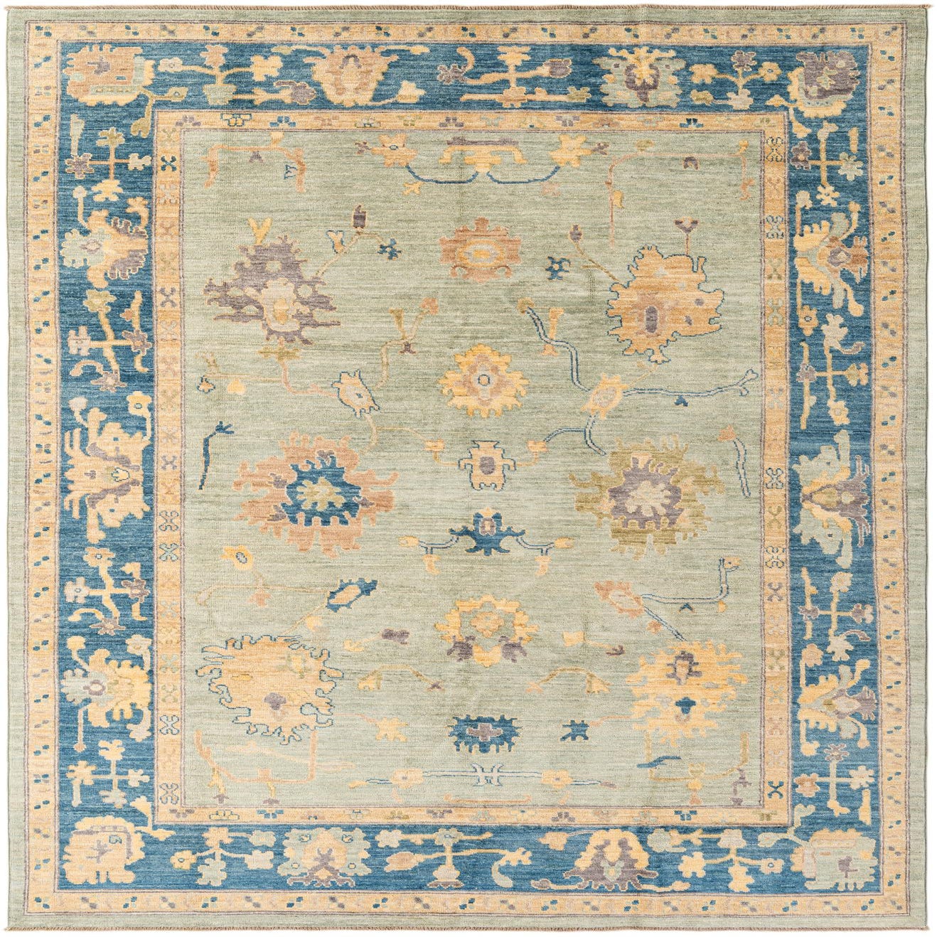 A 7x10 rectangular Oushak rug with a sage green field and a wide navy blue border, featuring traditional floral and vine patterns in gold, rust, and purple.