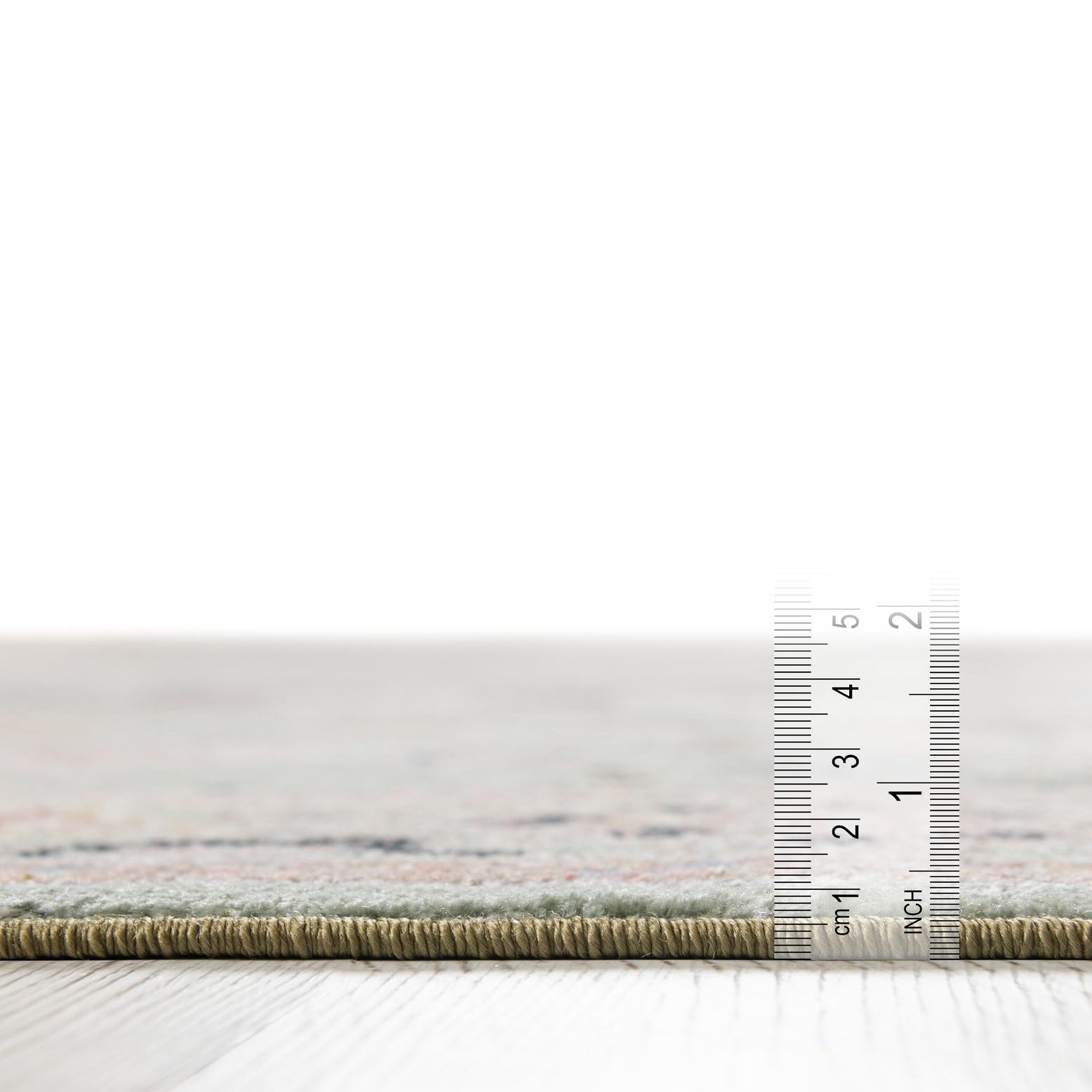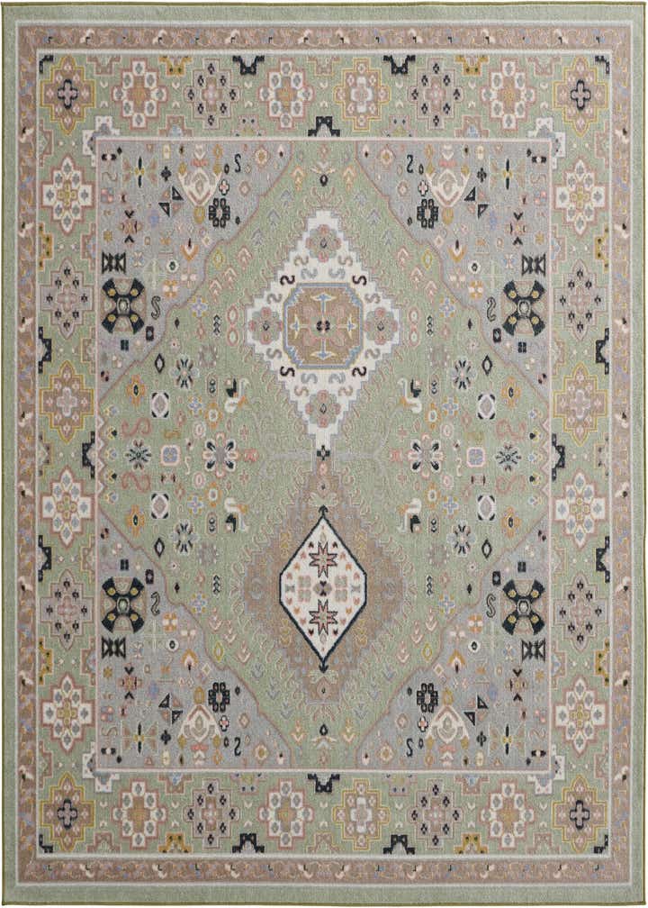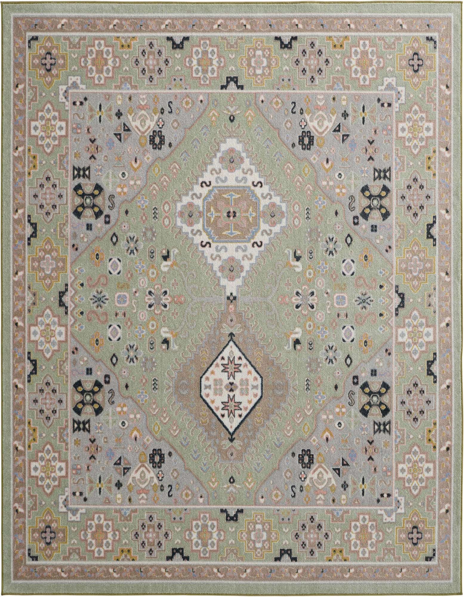 Primary color is Light Green. Colors in this rug include: Light Green, Beige, Black, Gray, Ivory, Pink.