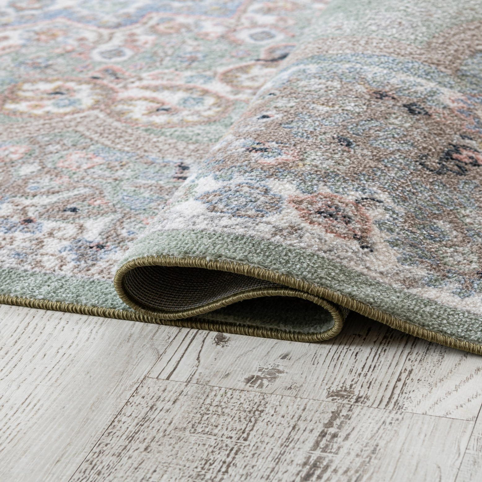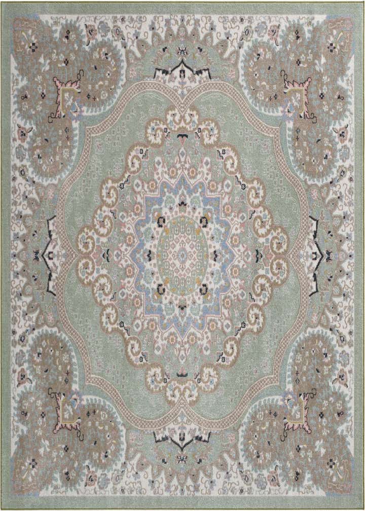 Primary color is Light Green. Colors in this rug include: Light Green, Beige, Black, Ivory, Light Blue, Pink.