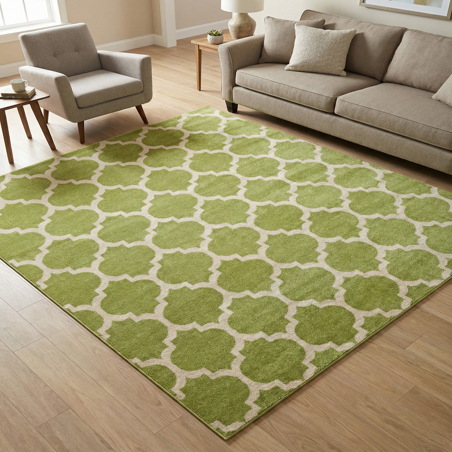 A geometric lattice of Moroccan-inspired medallions sits against a light green ground, with beige outlines that crisply define each quatrefoil and a richer green filling the motifs. The repeating pattern creates a balanced, contemporary look that pairs traditional shapes with a fresh colorway—light green provides an airy backdrop while beige and green add depth and contrast.