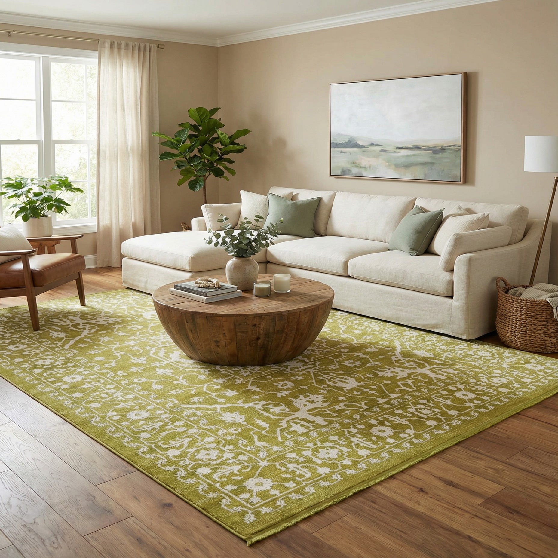 Given its classic patterning and contemporary color scheme, this piece is distinctly versatile, allowing for placement in a variety of interiors. It could serve as a calming foundation in a minimalist or Scandinavian-inspired space, or add a touch of color contrast to a modern farmhouse setting. Its subtle hues and detailed design would equally enhance a transitional living area or complete a bedroom with understated elegance.