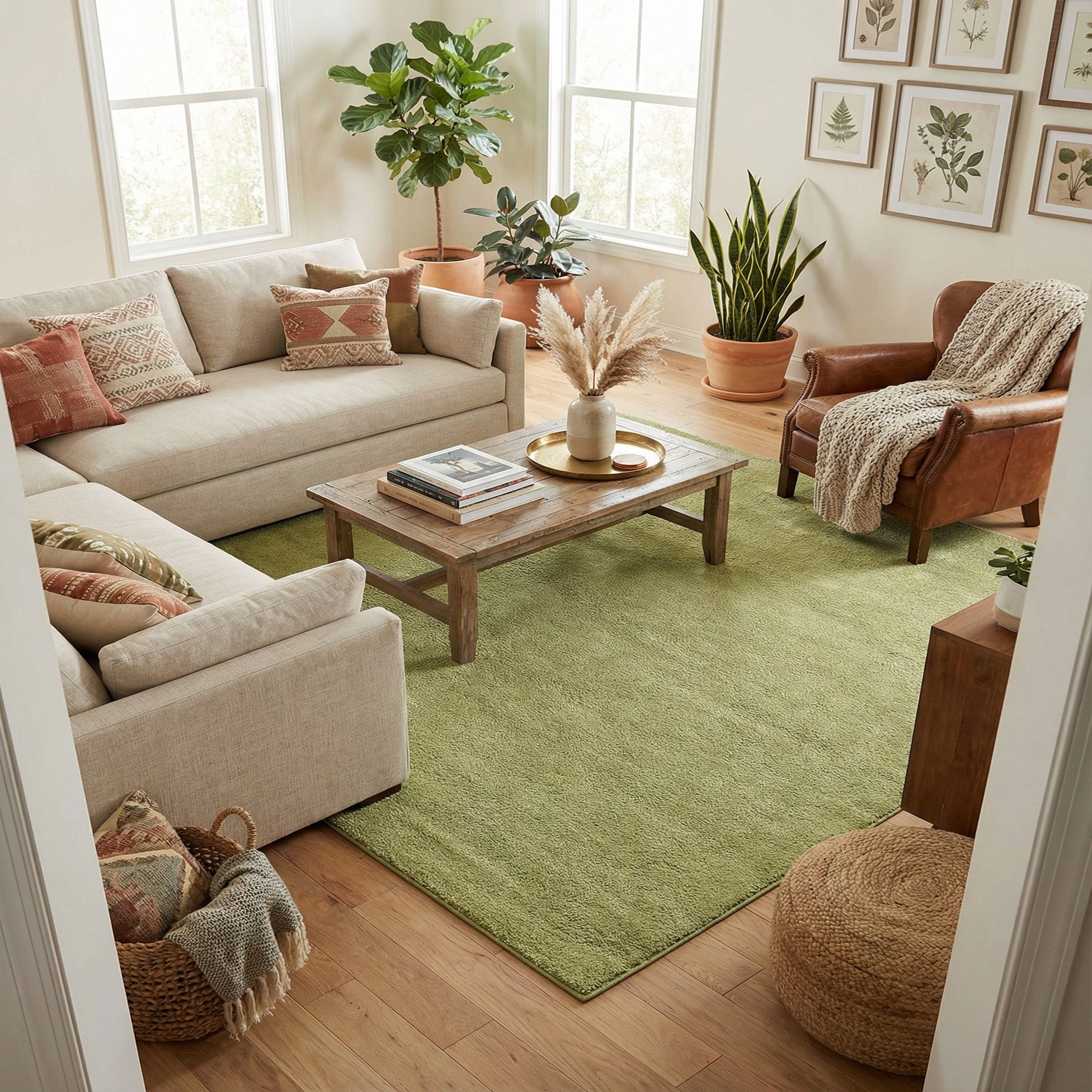 This rug works well in contemporary, Scandinavian, or casual transitional settings where a soft pop of color is welcome. Place it beneath a seating group to warm a living room, layer it at the foot of a bed for added comfort, or use it in a home office or nursery to introduce a soothing, nature-inspired tone. It pairs nicely with natural wood furnishings, white or neutral upholstery, and botanical accents for a fresh, relaxed look.