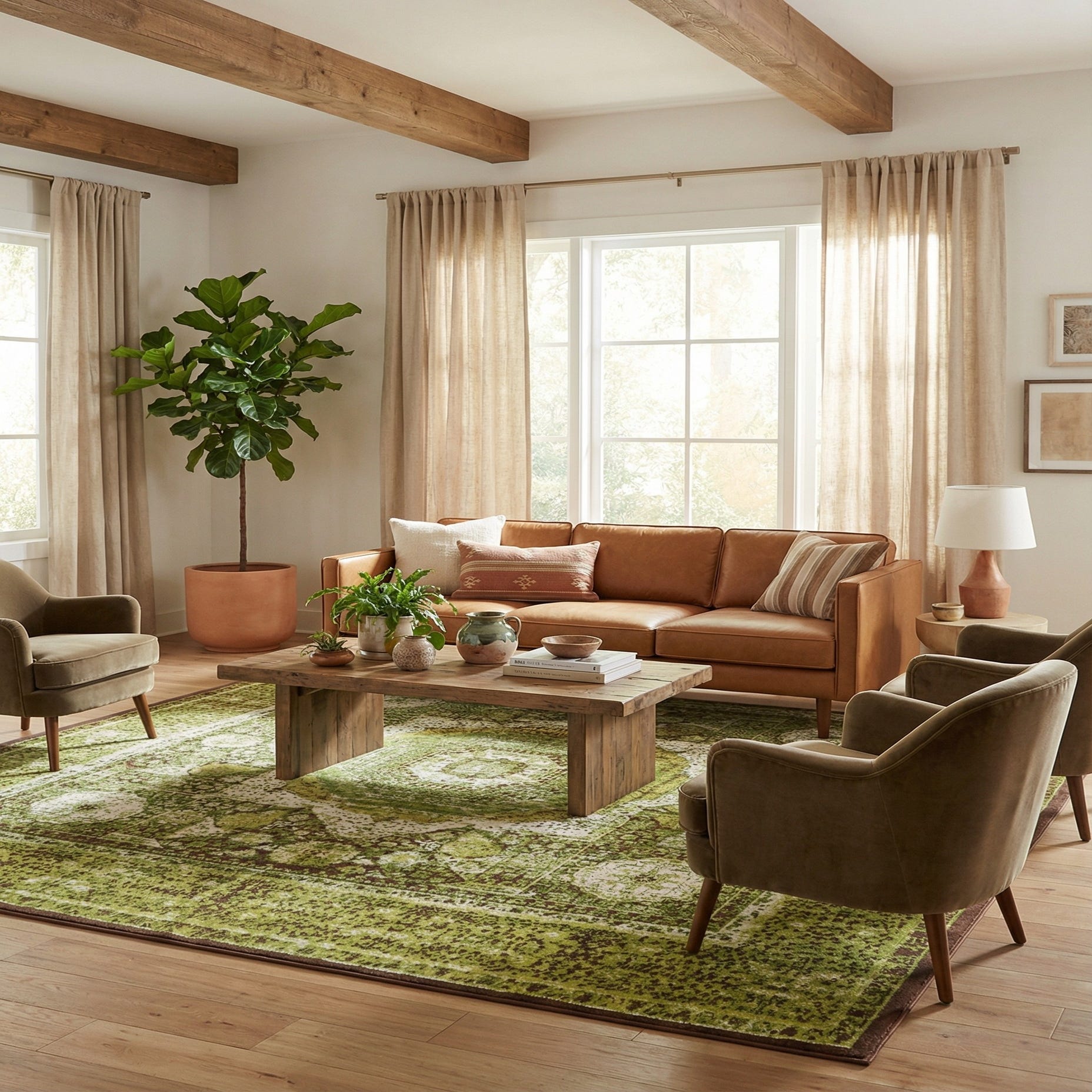 This palette and pattern pair naturally with warm wood tones and neutral upholstery, making the rug a good anchor for living rooms with mid-century or transitional furnishings. It also complements bohemian interiors when layered with woven textures and houseplants, and it can be used beneath a dining table or in an entryway to introduce color and pattern without overwhelming the space. The overall look brings an earthy, lived-in warmth that adapts well to a range of interior styles.