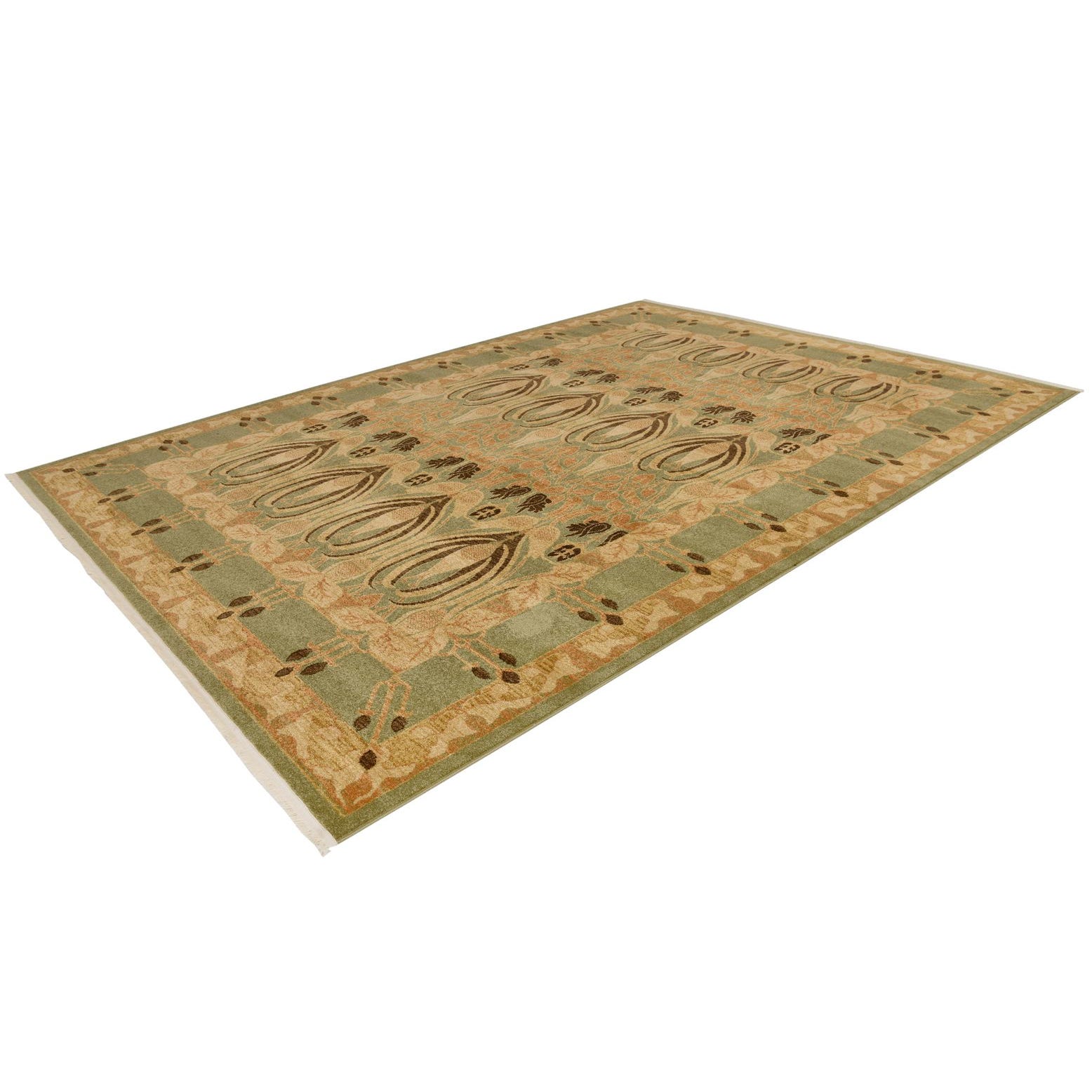 Primary color is Light Green. Colors in this rug include: Light Green, Cream, Olive, Tan, Brown.
