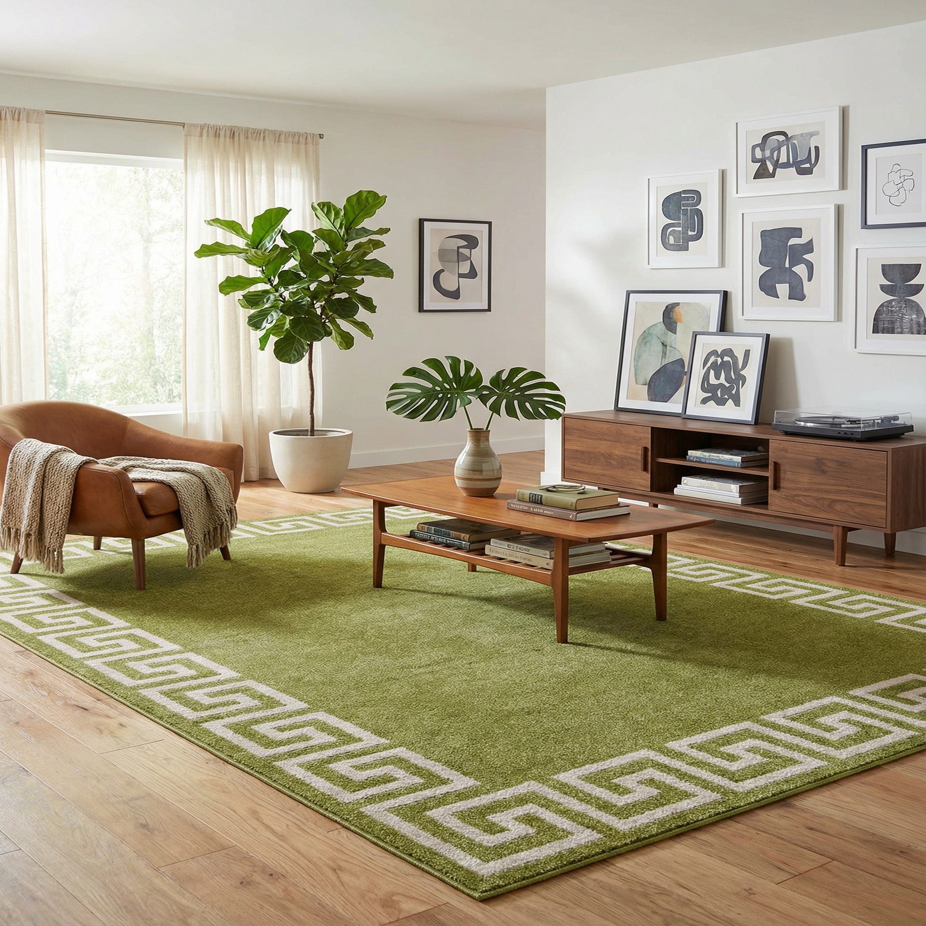 A clean, geometric Greek?key border in soft beige frames a solid light green field, creating a balanced look that reads both classic and contemporary. The machine-made construction in 100% polypropylene produces a low-pile surface with a subtle sheen and a pleasantly dense hand — smooth underfoot and even in appearance. The pattern is restrained and architectural, allowing the border to provide definition without overwhelming the room.