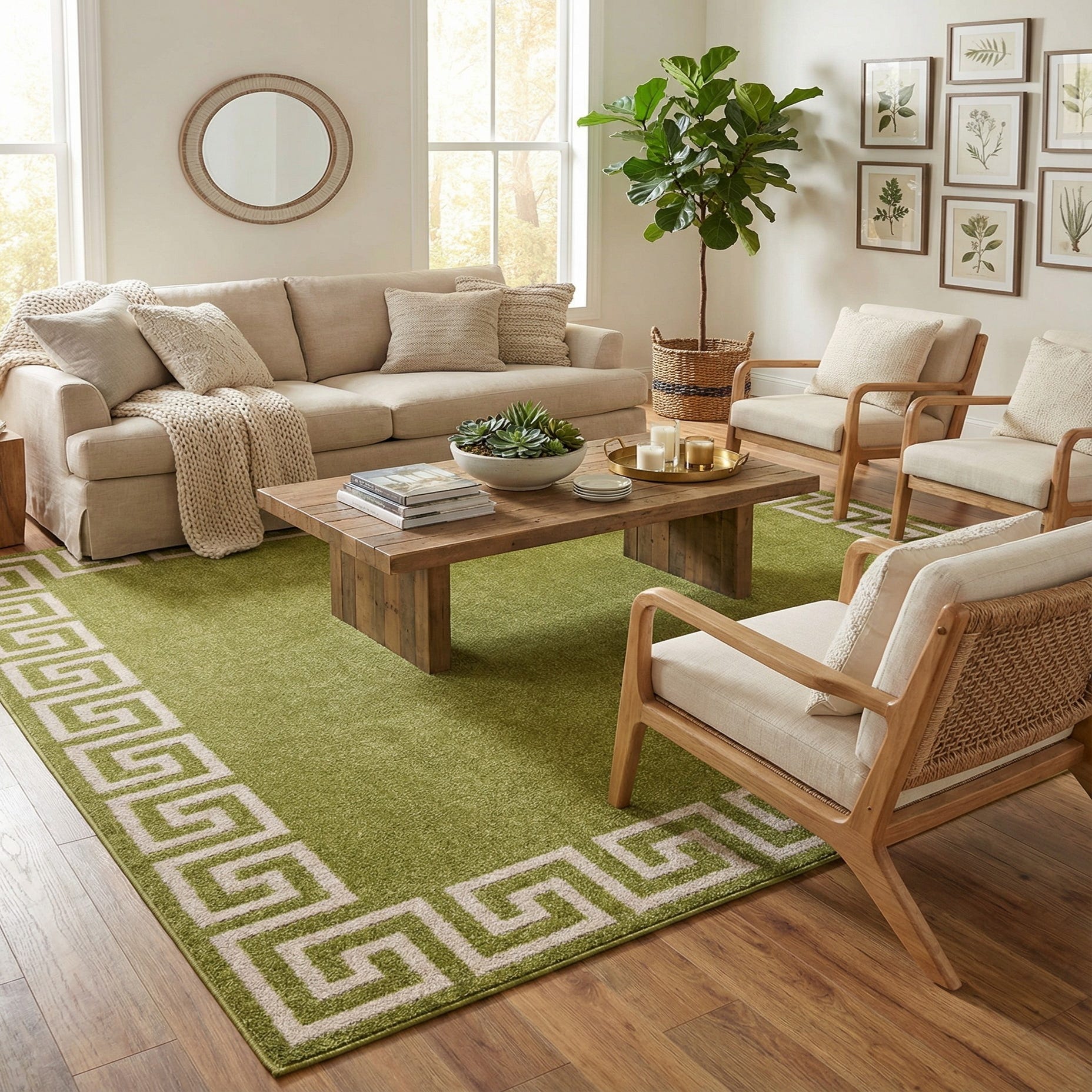 A 9x12 rectangular green area rug with a light beige Greek Key border pattern, suitable for a living room or bedroom.