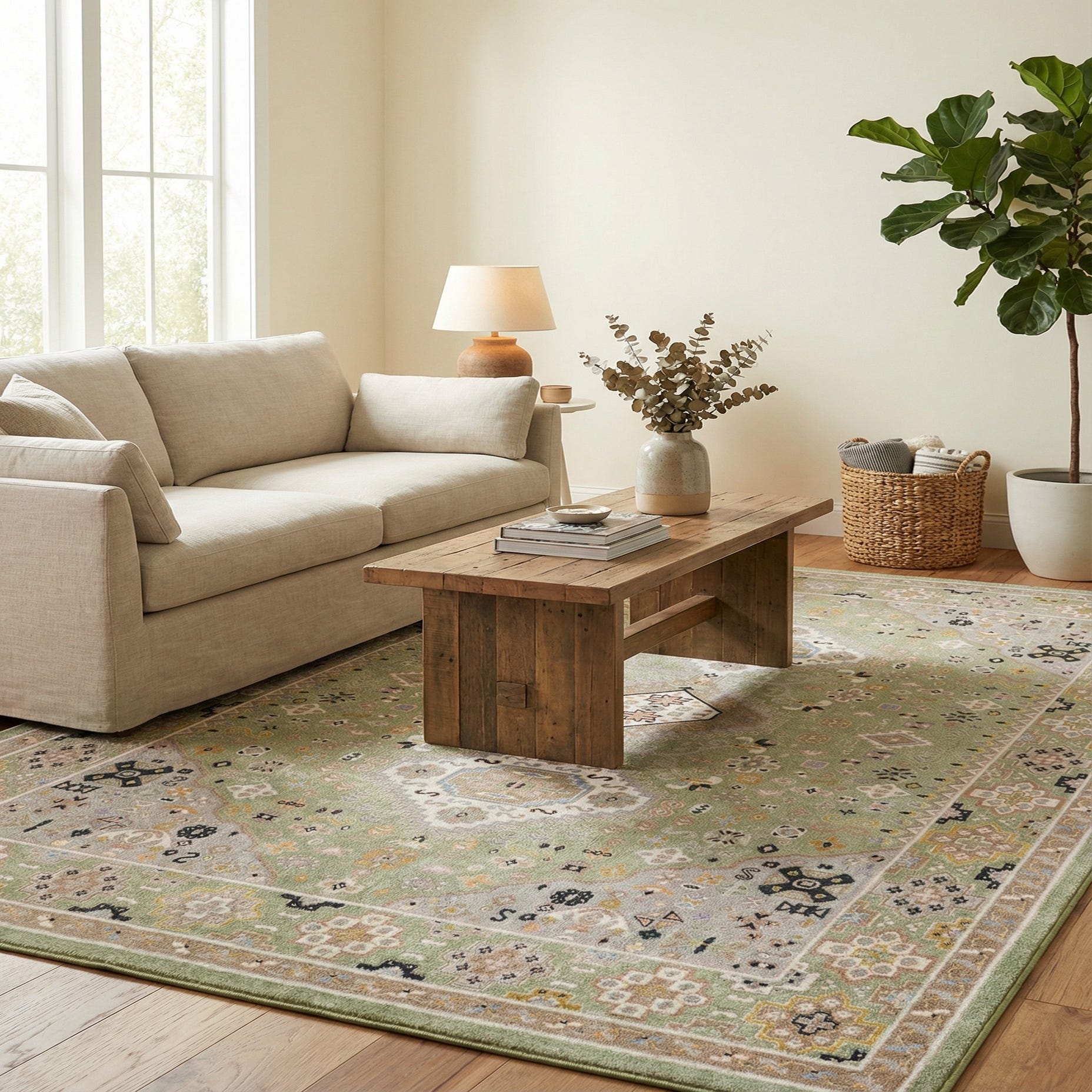 Primary color is Light Green. Colors in this rug include: Light Green, Black, Brown, Gray, Ivory, Pink, Yellow.