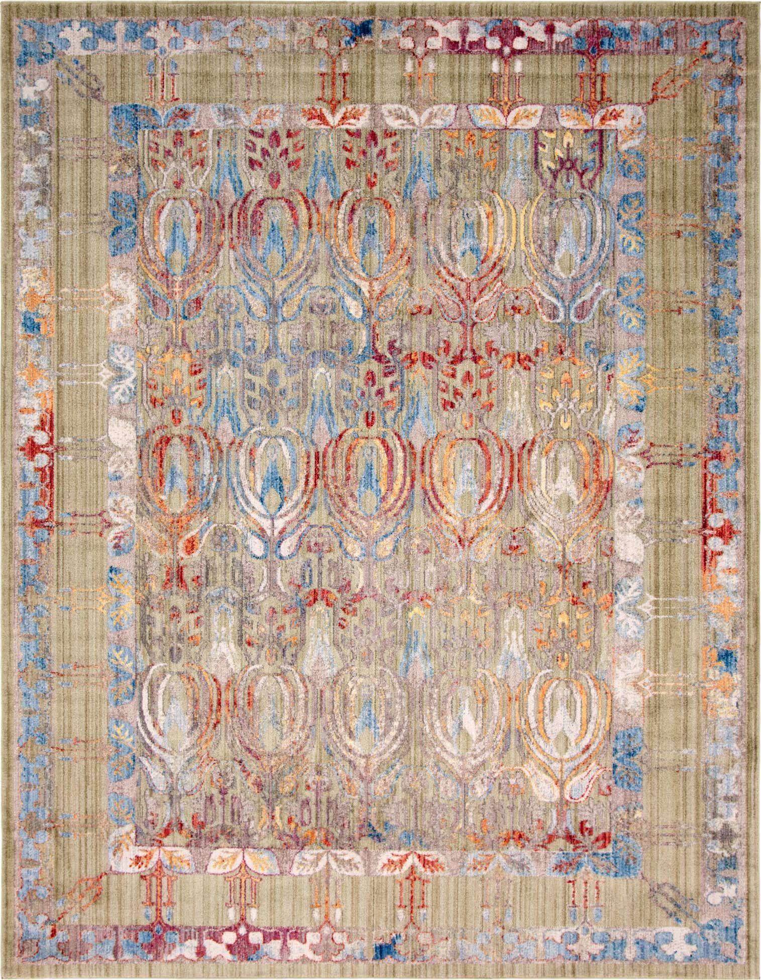 Primary color is Light Green. Colors in this rug include: Light Green, Blue, Gold, Ivory, Orange, Red.