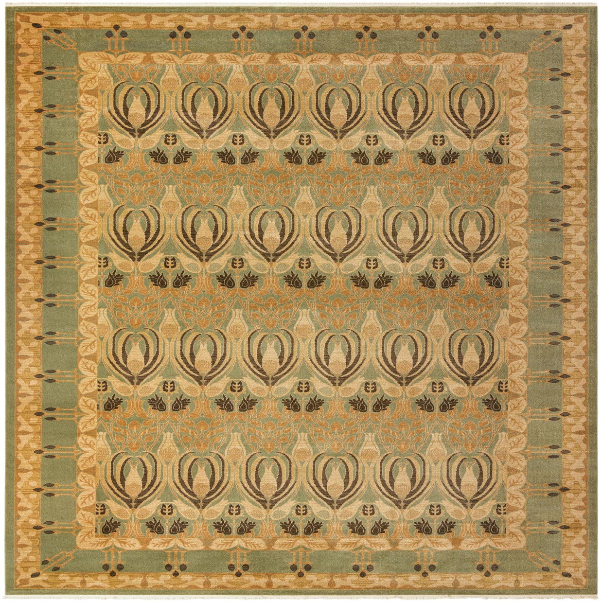 Primary color is Light Green. Colors in this rug include: Light Green, Cream, Olive, Tan, Brown.
