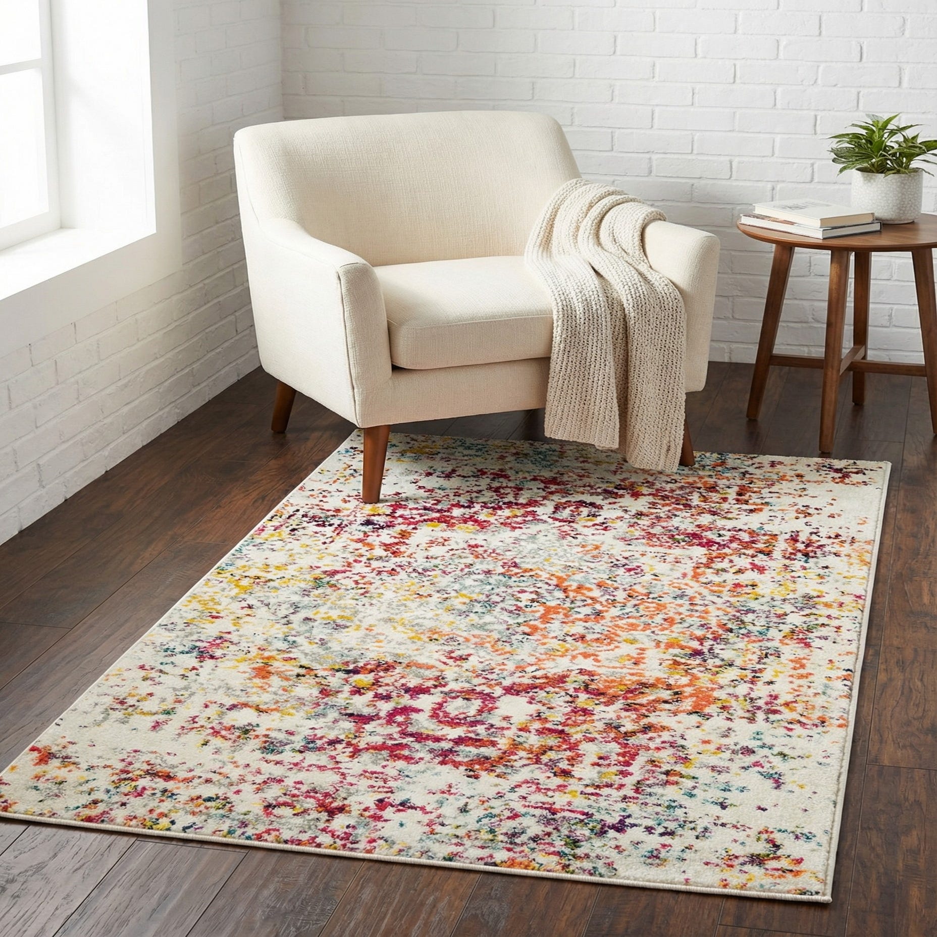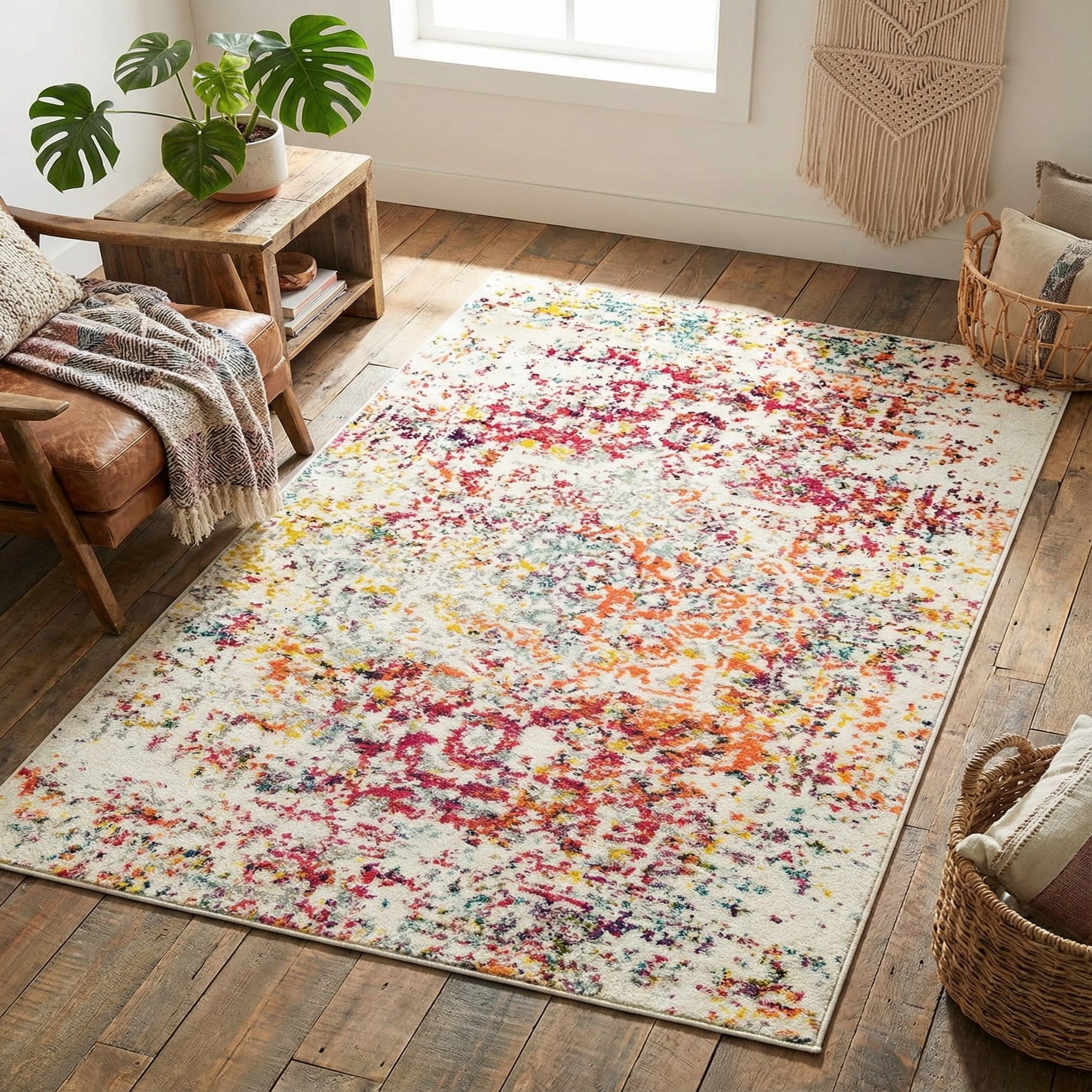 Place this piece where a pop of color and pattern will lift the room: beneath a sofa in a contemporary living room, in a neutral bedroom to add warmth, or in an entry to energize a compact space. It also pairs well with mid-century and modern furnishings, warm wood tones, or muted gray upholstery when you want a balanced, playful focal point.