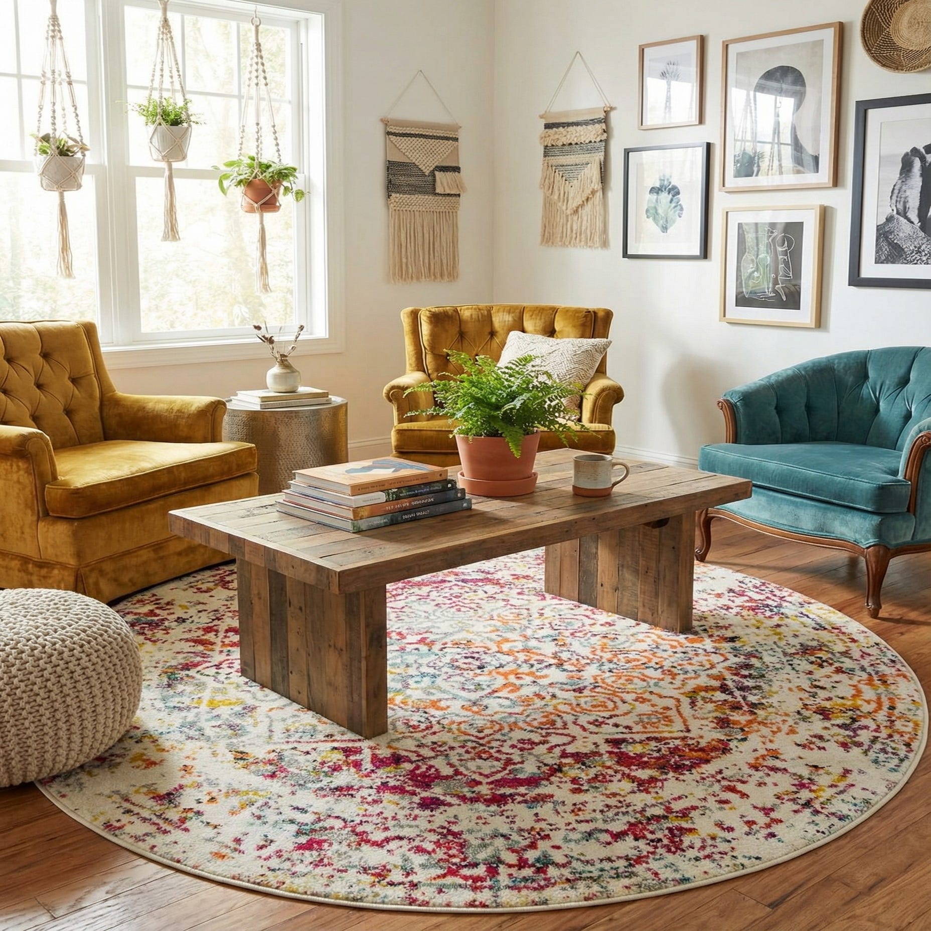 This round design works well where you want a touch of color without overwhelming the room — try it beneath a round dining table, as an anchor for a cozy seating nook, or in a bedroom to define a reading corner. It pairs easily with neutral sofas and warm wood tones, and also complements eclectic or bohemian schemes that welcome bold, scattered color.