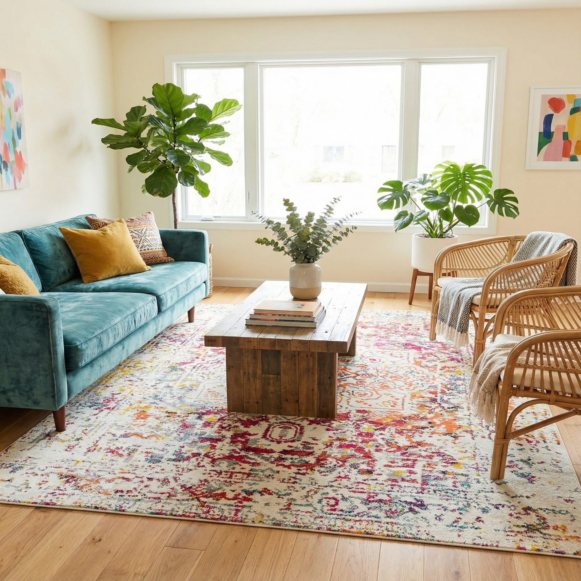 Machine-made from 100% polypropylene, the surface has a low, plush hand that feels comfortable underfoot while remaining firm enough to anchor seating or a dining set. The color palette and aged motif work well in contemporary living rooms, eclectic or bohemian spaces that benefit from bold accents, and transitional interiors seeking a playful touch against neutral furniture. Pair it with warm wood tones and simple upholstery to let the colors pop, or use it to introduce lively contrast in a minimalist or modern farmhouse scheme.