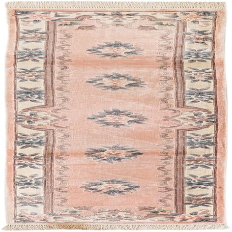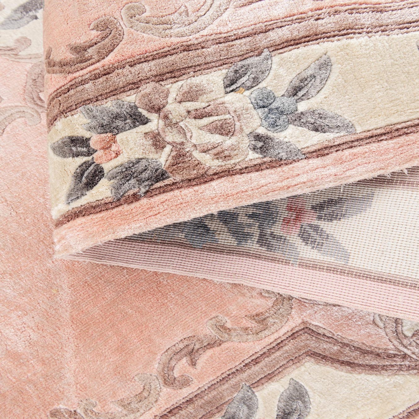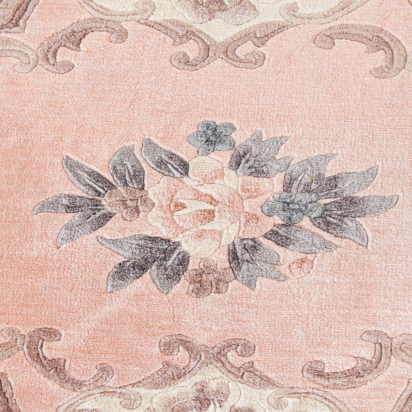 Primary color is Light Pink. Colors in this rug include: Light Pink, Brown, Ivory, Navy Blue, Green.