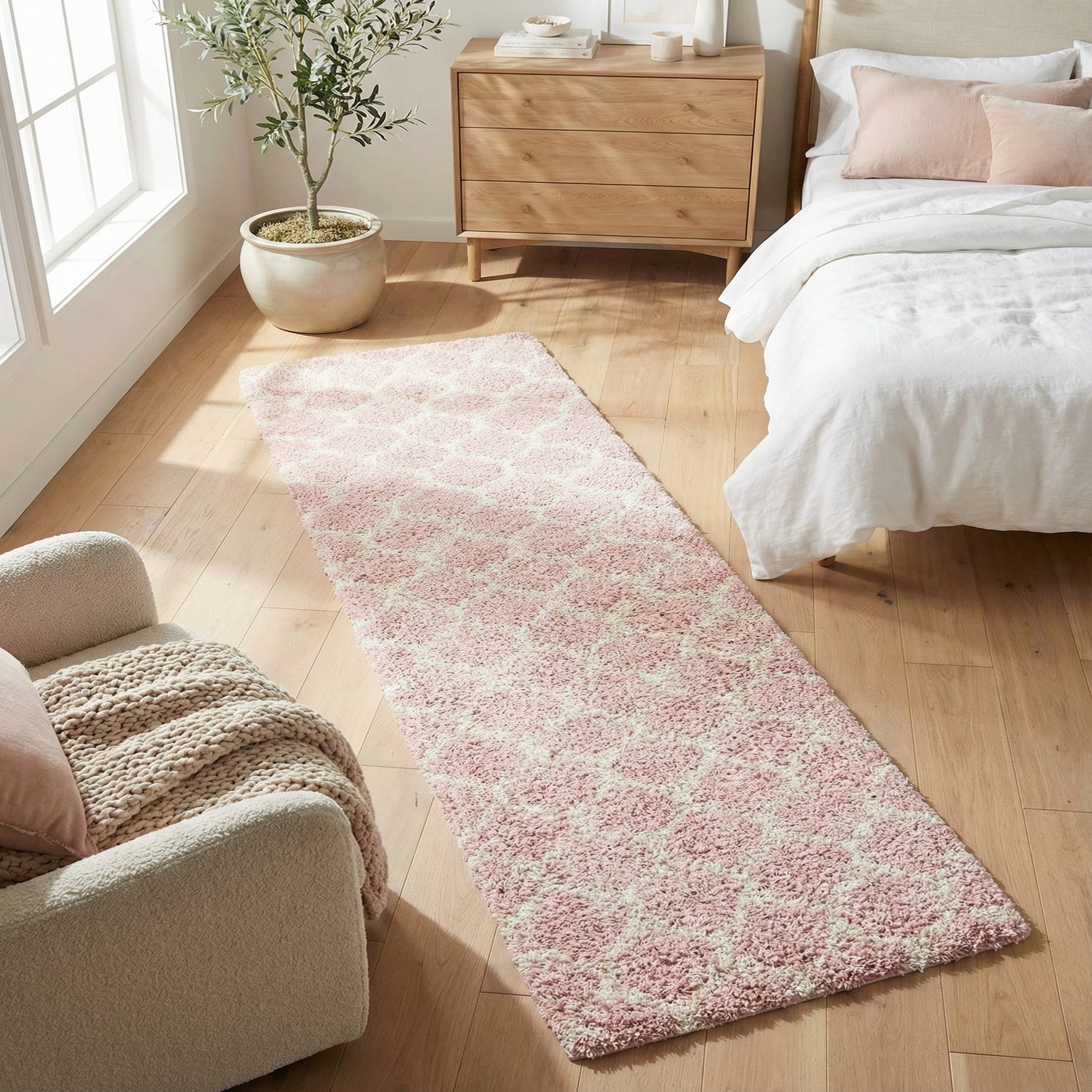 Ideal as a hallway or bedroom runner, this piece pairs well with pale woods, white or soft-gray walls, and linens in complementary pastels for an airy, relaxed look. It also suits a nursery, dressing area, or a layered living room scheme where a textural, feminine accent is desired; combine it with brass or rose-gold hardware and simple, modern furnishings to balance the softness with clean lines.