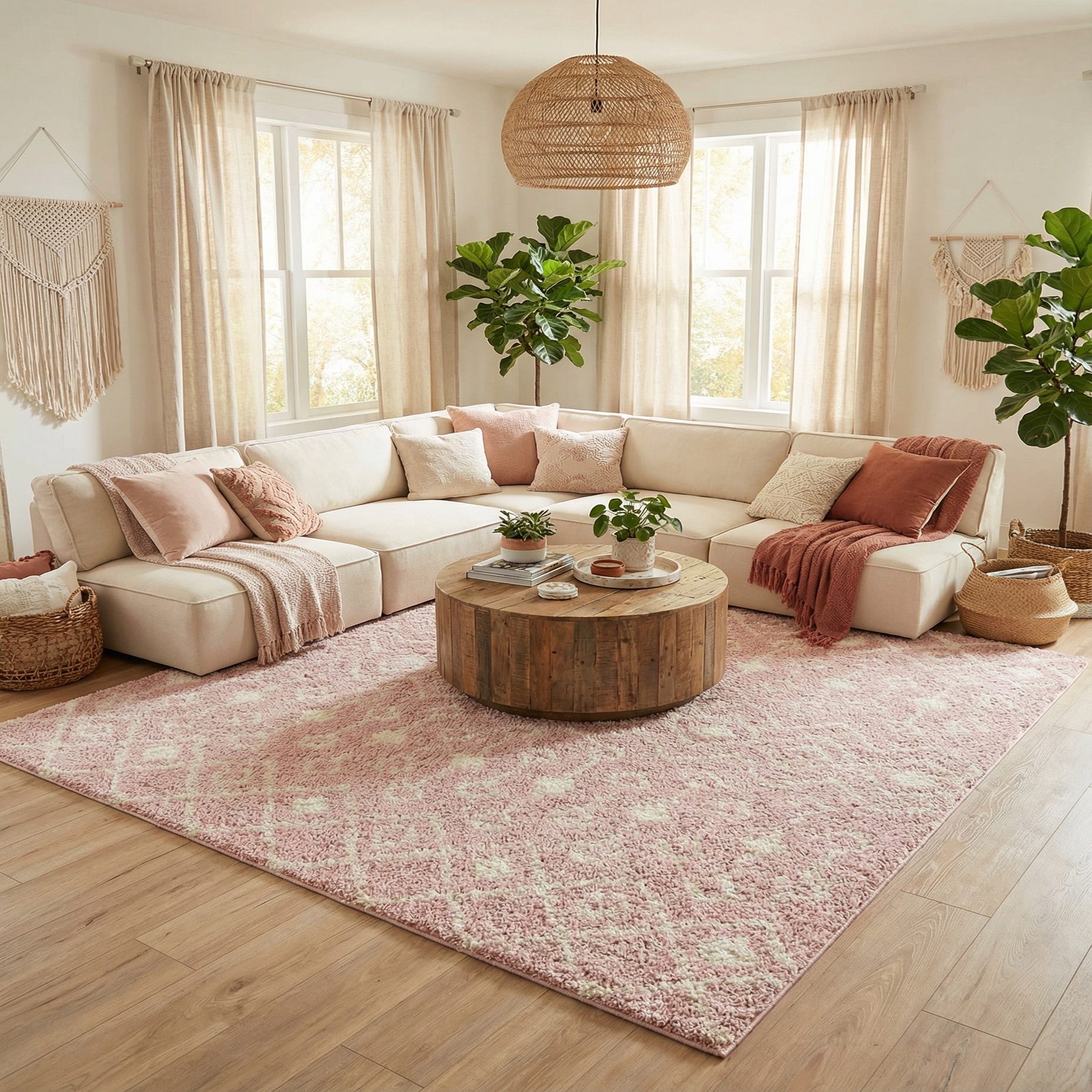 A soft light-pink field provides a gentle backdrop for a classic Moroccan trellis motif worked in ivory. The geometric diamonds and stylized medallions are woven into a high-pile shag that gives the pattern a softly blurred, dimensional look — the ivory shapes lift slightly from the pink as the pile catches the light. Running your hand across the surface, the long polypropylene fibers feel plush and cushioned, offering a cozy texture underfoot without a stiff or coarse finish.