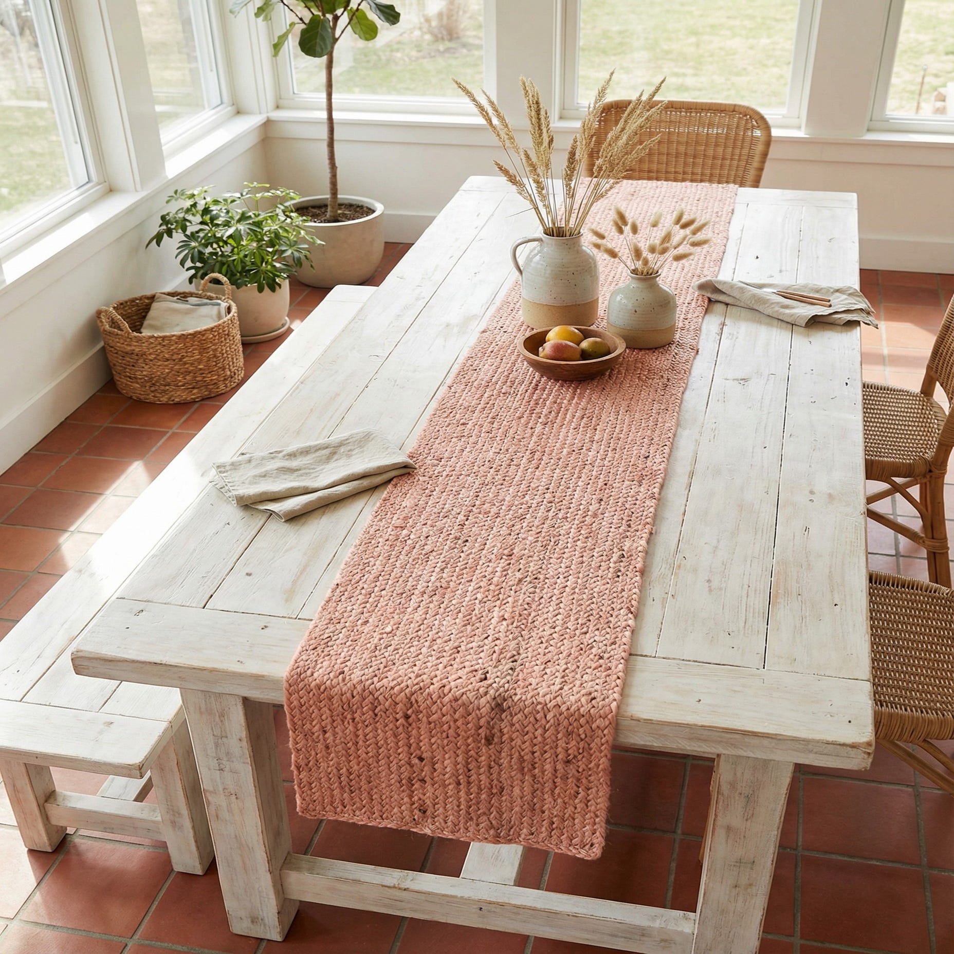 This runner fits comfortably in casual and layered dining schemes: place it on a reclaimed wood table for a cottage or farmhouse vibe, or layer it over a neutral tablecloth in a coastal or boho dining area to introduce a soft wash of color. It also works well on a console or buffet to add texture without overwhelming other decor; pair with cream linens, matte ceramics, and warm metal accents to highlight the jute’s natural tones.