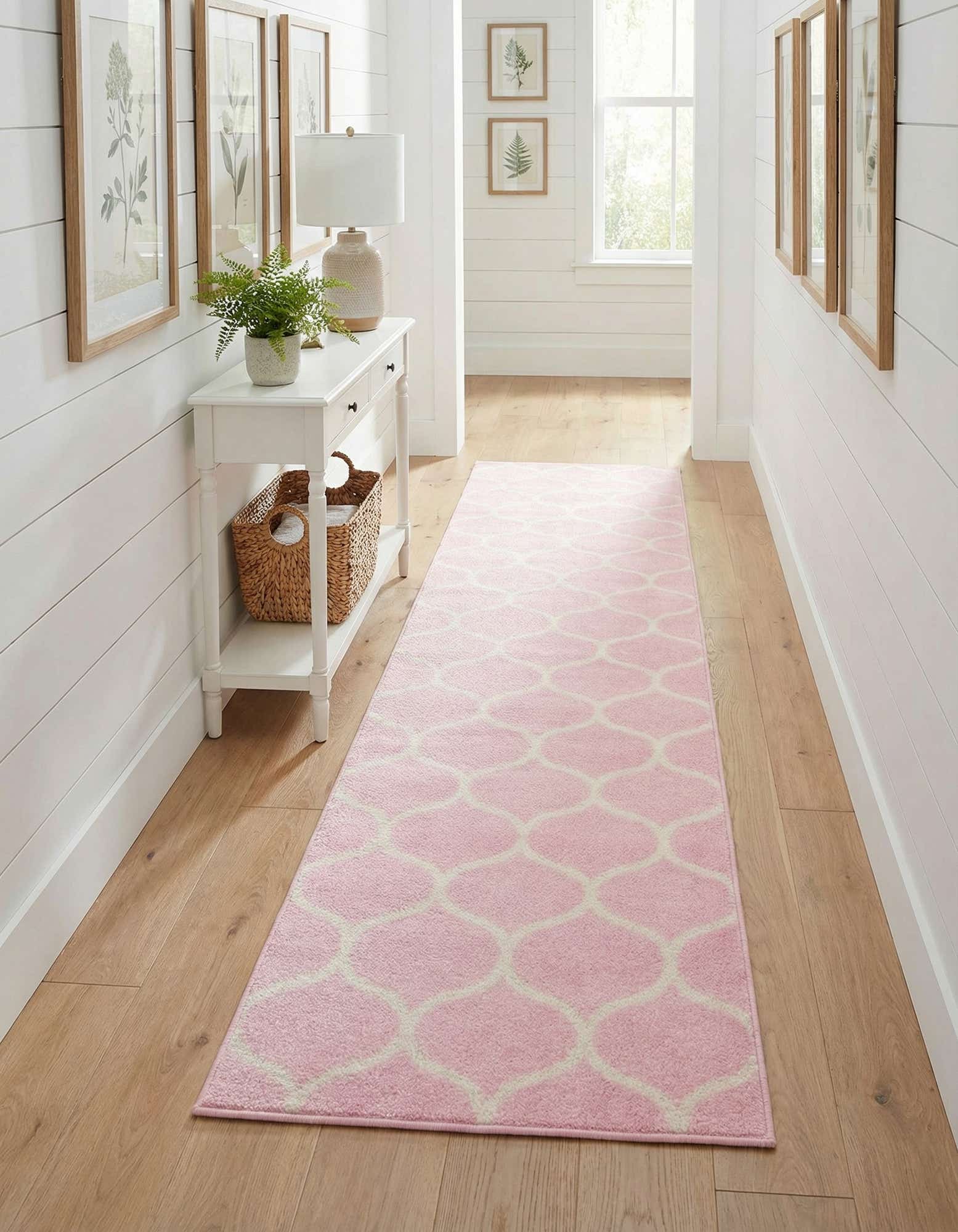 A 13 ft runner rug in light pink with a repeating off-white modern trellis pattern, ideal for a hallway.