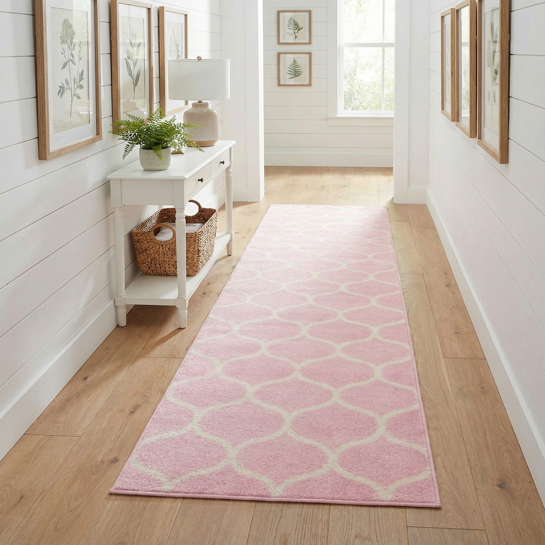 Soft and tactile underfoot, this machine-made rug is crafted from 100% polypropylene with a low-to-medium pile that holds its shape while offering a gentle, cushioned feel. A light pink field is overlaid with an ivory lattice of rounded, arabesque motifs, creating a modern trellis pattern that reads clean and rhythmic across the length of the runner. The two-tone construction gives a subtle dimensional quality to the design, with the ivory pattern providing a soft contrast against the plush pink ground.