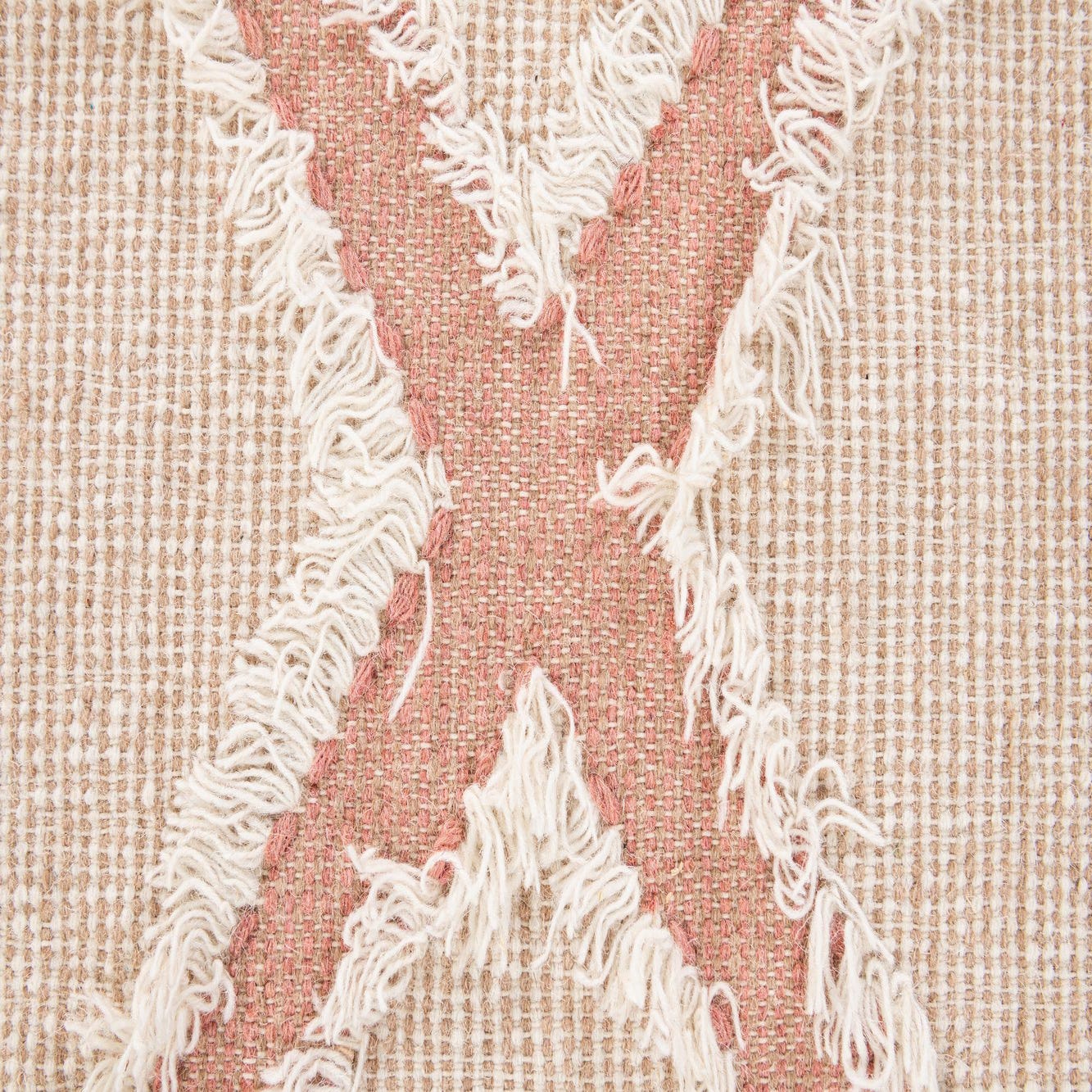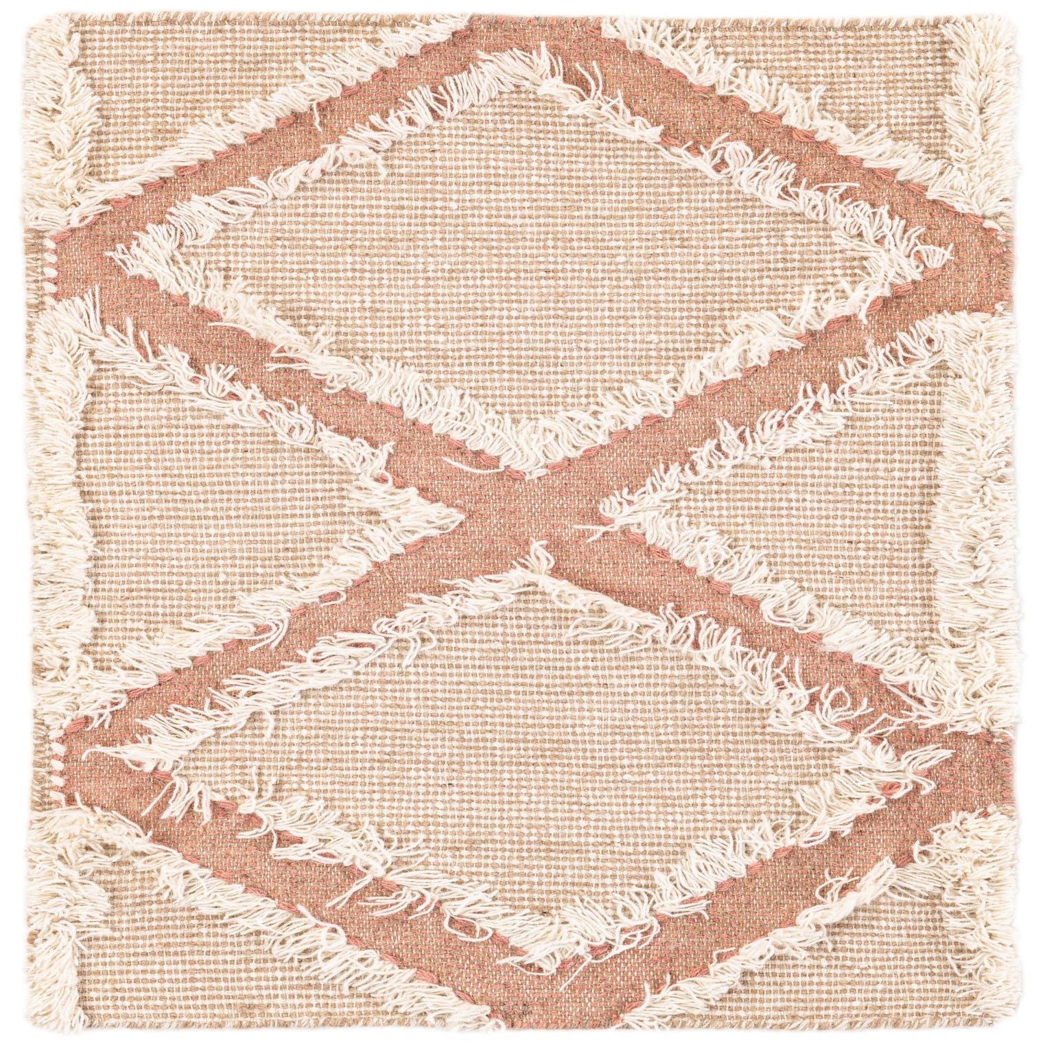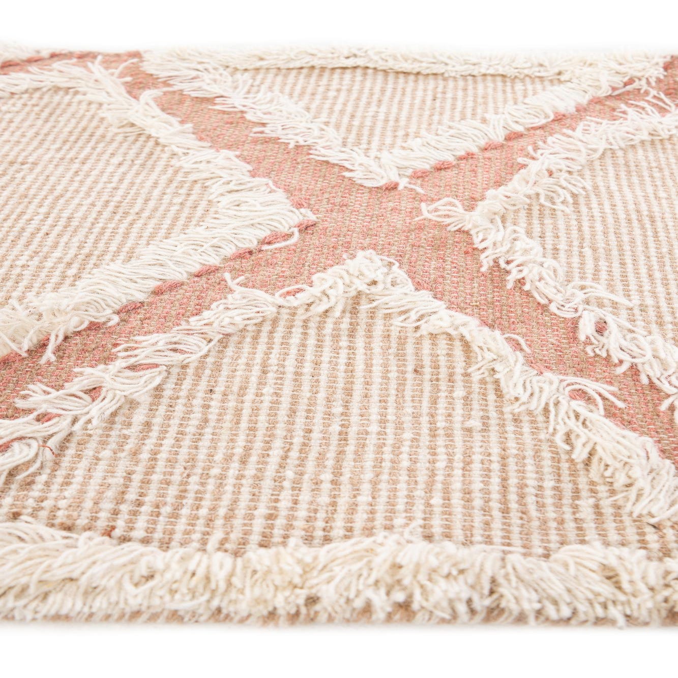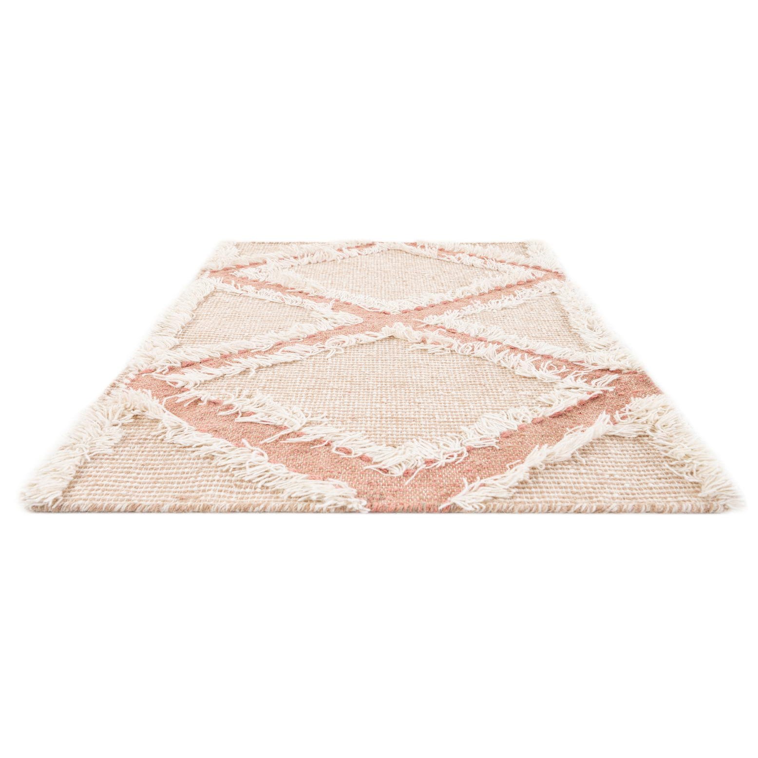 A 2x3 rectangular pink and beige modern shag rug with a diamond pattern, handmade from wool.