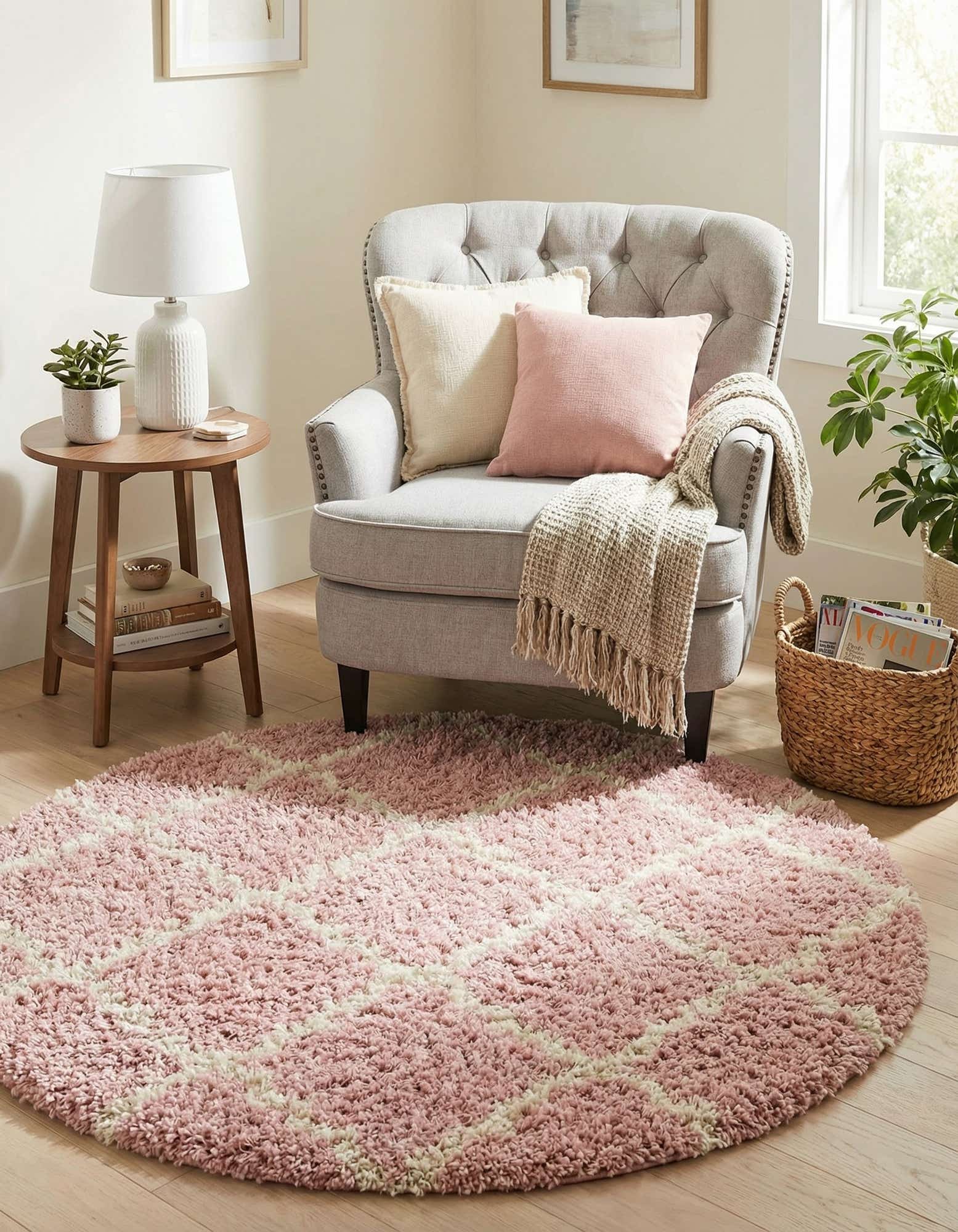 A soft, round pink and cream shag rug with a modern textured pile, ideal for adding warmth to an indoor space.