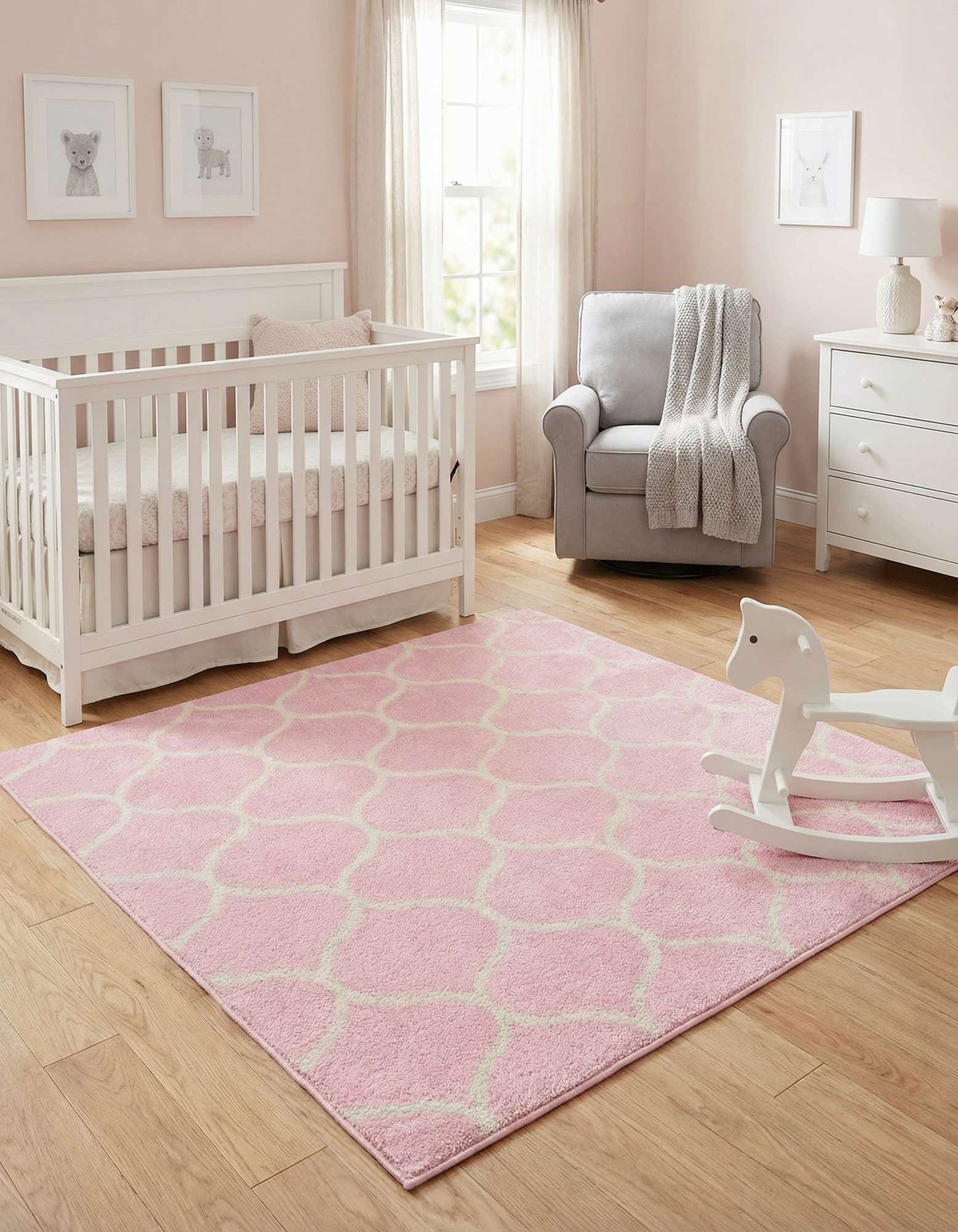 A 3'x3' square pink rug with a modern off-white trellis pattern, suitable for an indoor living space.