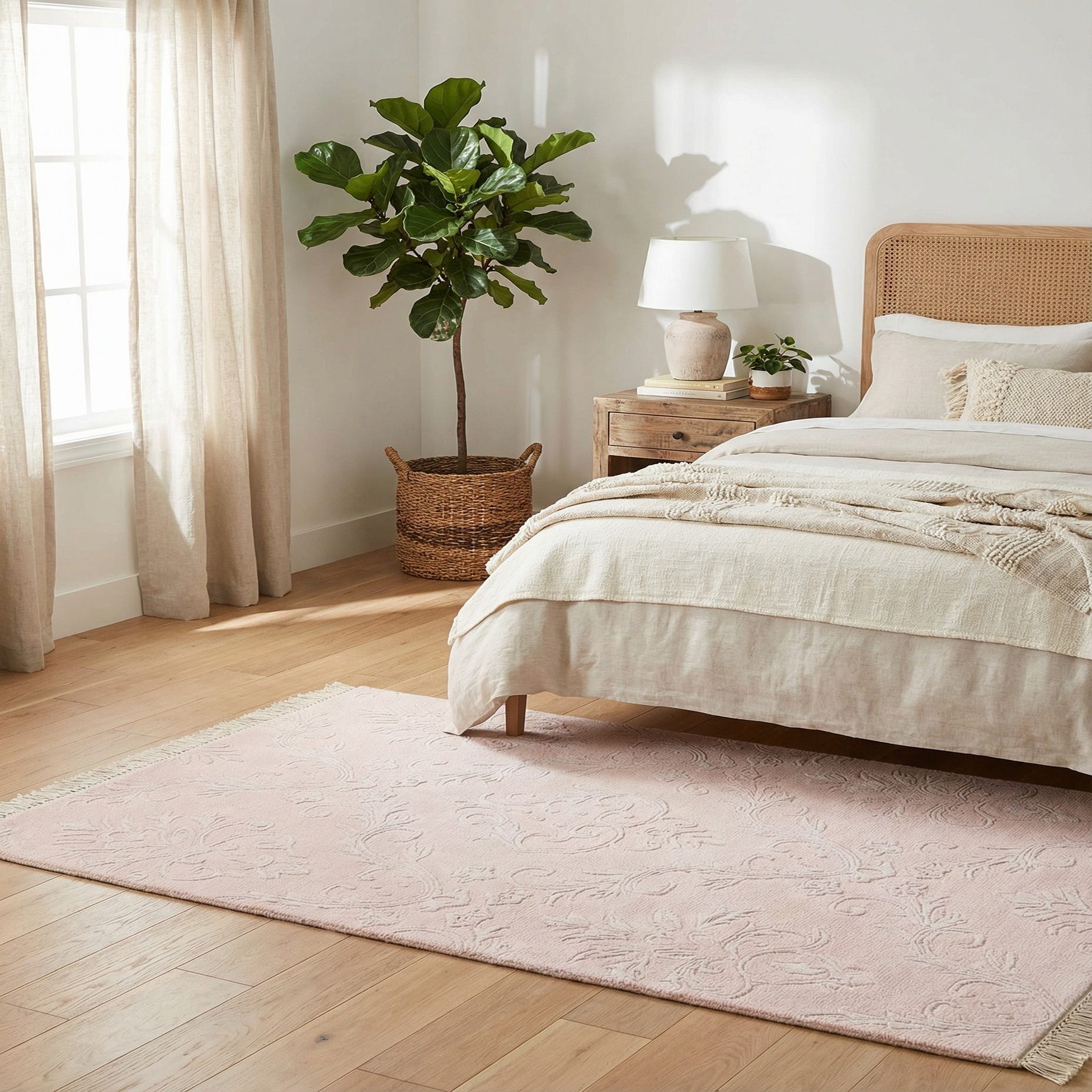 A 3x5 rectangular pink wool rug with a subtle, raised oriental pattern and fringed ends.