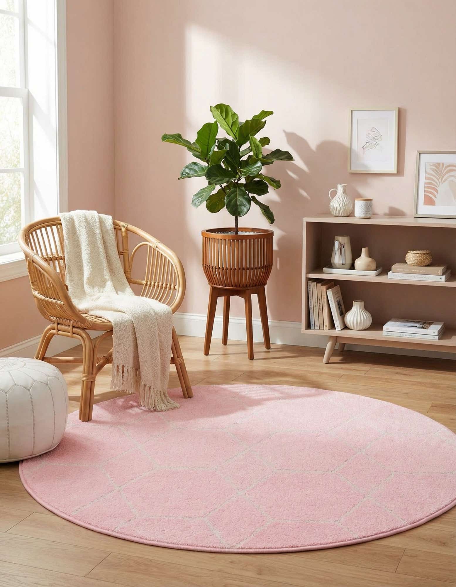 A 4' 0 x 4' 0 round pink rug with a subtle white geometric trellis pattern, ideal for a child's room or nursery.