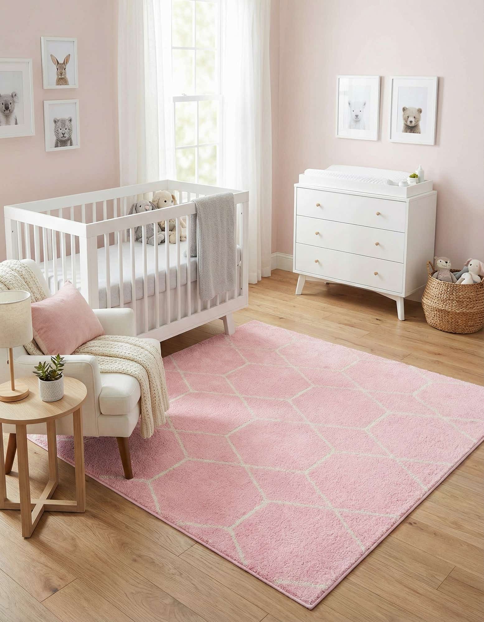 This piece works well in a nursery or a girl's bedroom, adding a calm, contemporary note without dominating the room. It also makes a cozy anchor for a dressing area or a small reading nook, and pairs nicely with white or light-wood furnishings, soft gray upholstery, and brass or rose-gold accents. Use it to soften minimalist schemes or to layer in a transitional space where pastel color and simple geometry bring warmth and structure.