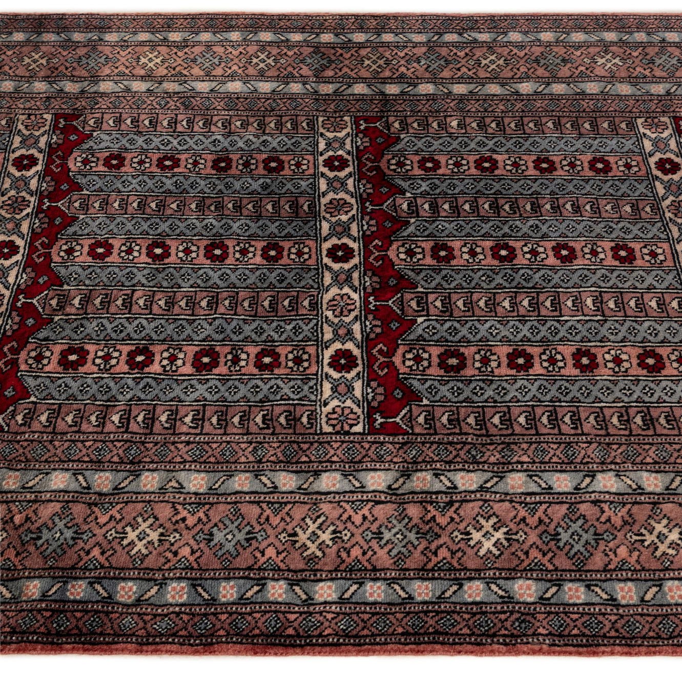 A 4x6 rectangular Bokhara rug in shades of pink, red, and blue with intricate traditional patterns and fringe.