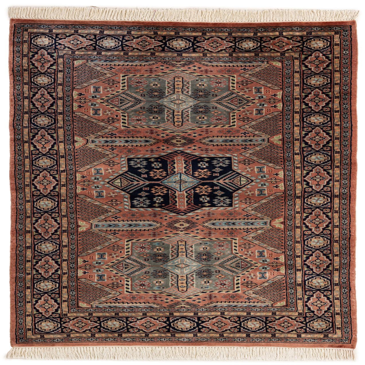 A 4x6 rectangular Bokhara wool rug in shades of pink, blue, and black, featuring a traditional tribal medallion pattern with intricate details and fringed ends.