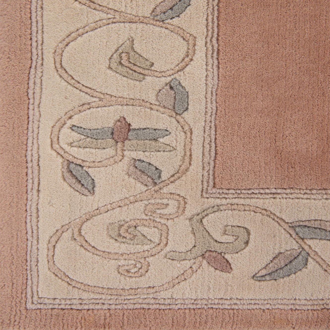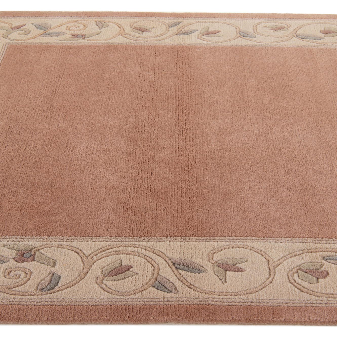 A 4x6 rectangular pink wool rug with a cream border featuring an elegant floral and vine pattern in subtle green, blue, and brown tones.