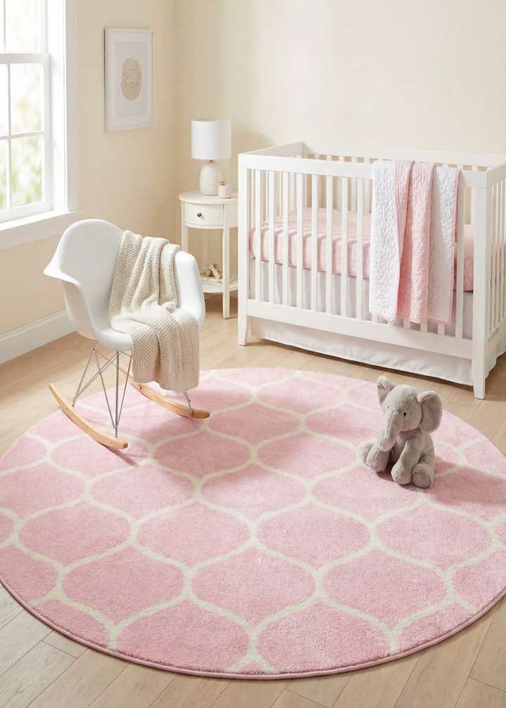 Soft to the touch with a clean, modern pattern, this round rug pairs a light pink ground with an ivory trellis motif that traces gentle, ogee-inspired curves across the surface. Machine-made from 100% polypropylene, the pile has a low-to-medium profile that gives a subtle plushness underfoot while keeping the overall surface even and smooth. The repeating pattern creates a calm, rhythmic look that keeps the palette feeling light and open.
