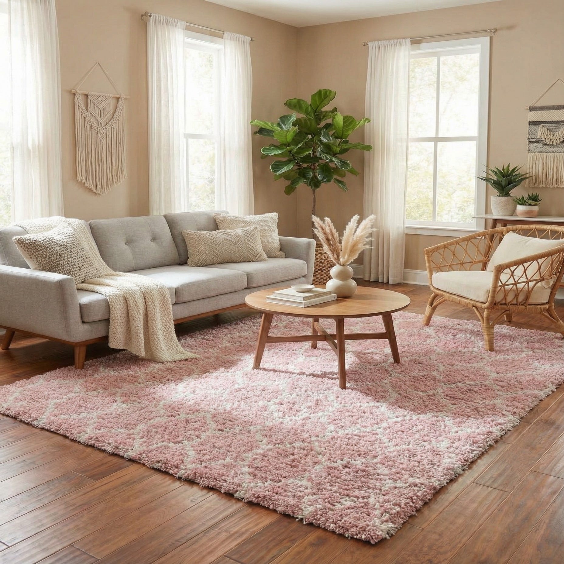 A 5x8 rectangular pink shag rug with a subtle cream trellis pattern, featuring a textured high-low pile.