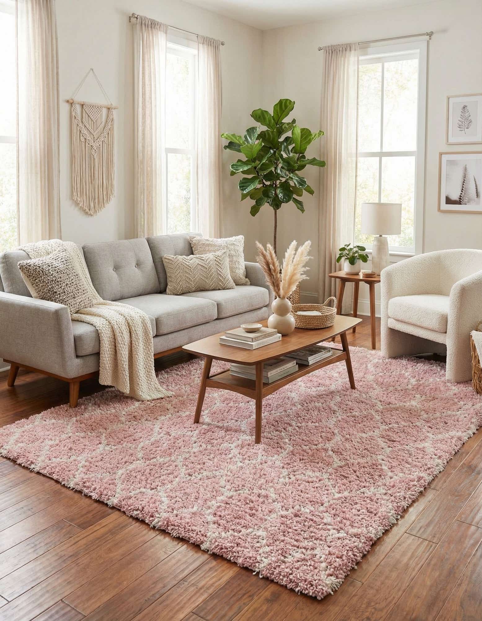 A plush, light pink shag with an ivory lattice pattern brings soft texture and subtle geometry to the floor. The rounded diamond motif is formed by low-profile ivory outlines that contrast gently against the lofty pink pile, creating a tactile, layered effect you can feel underfoot. Machine-made from 100% polypropylene, the rug offers a plush hand and consistent construction across the surface.