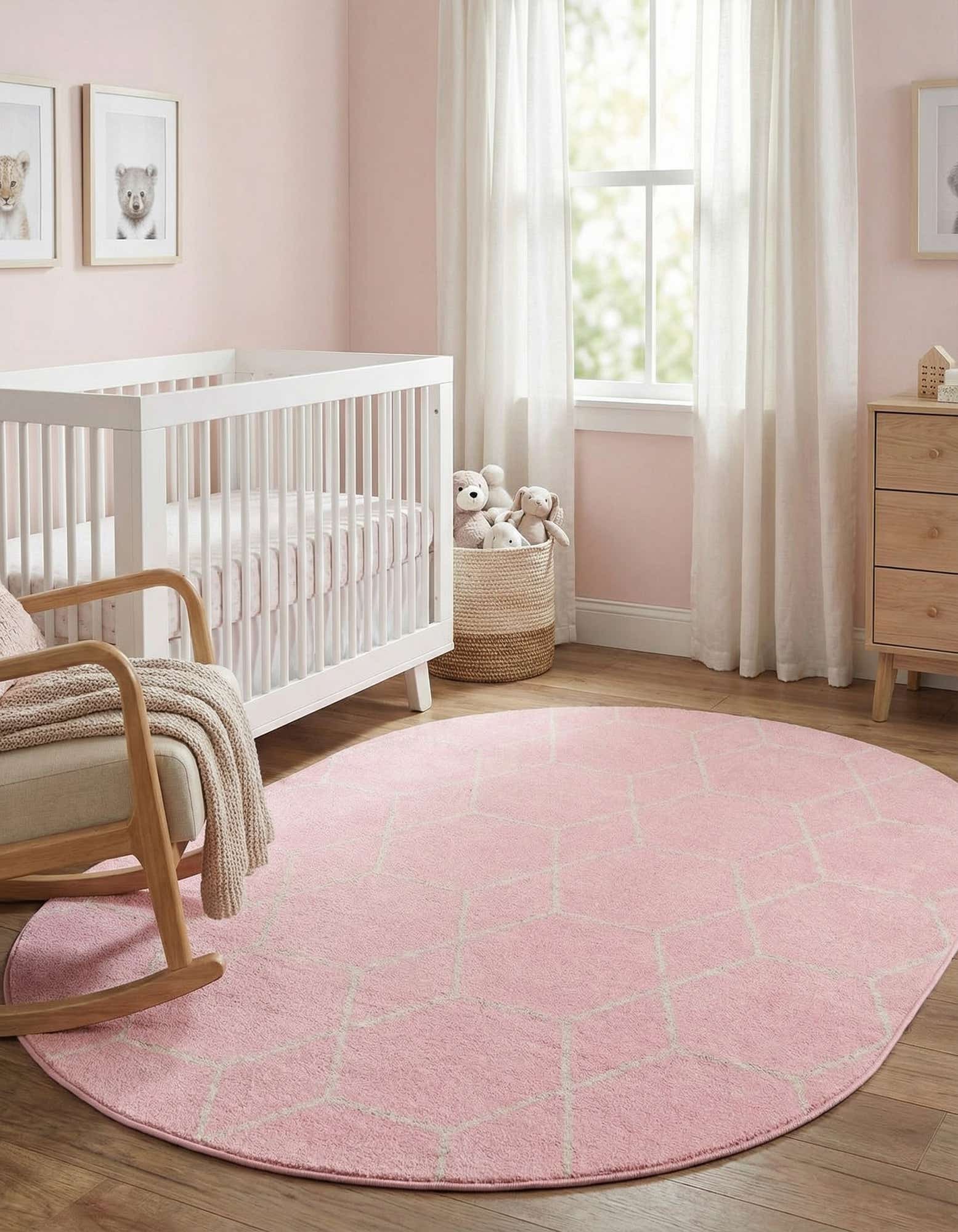 A 5' 3 x 8' 0 oval pink rug with a modern trellis pattern in a lighter shade, made from polypropylene.