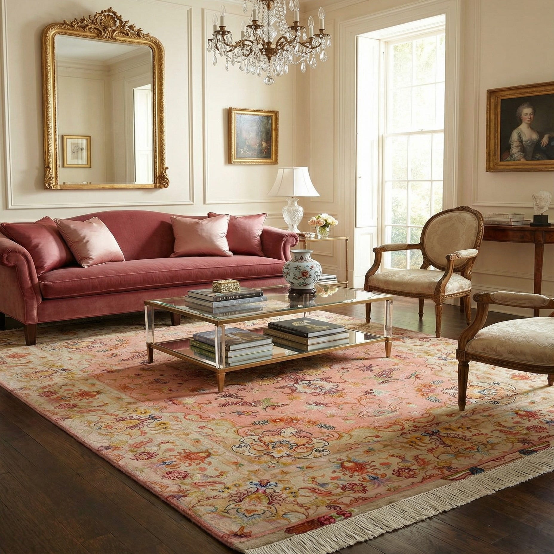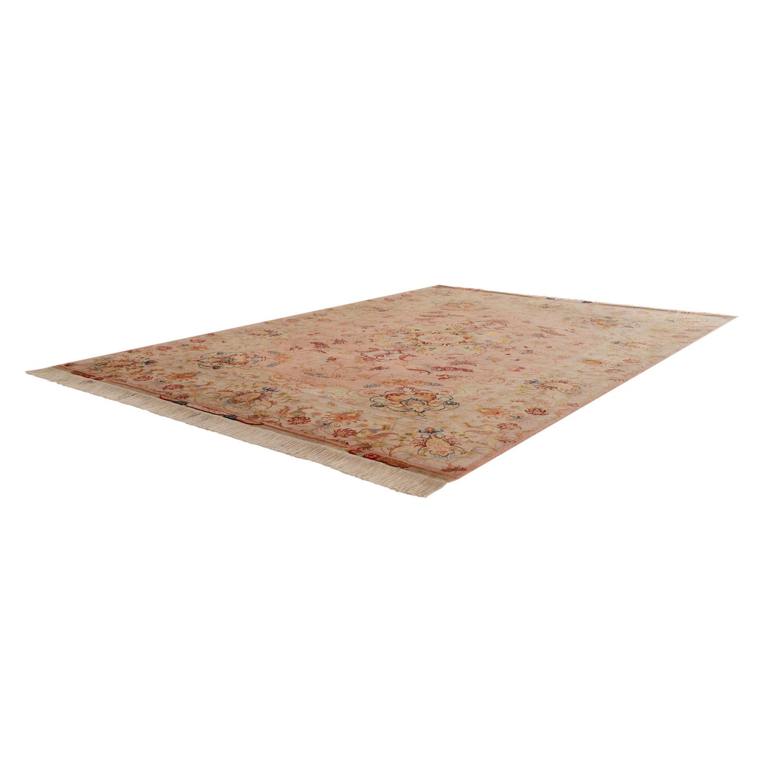 Primary color is Light Pink. Colors in this rug include: Light Pink, Brown, Cream, Green, Ivory, Red, Yellow.
