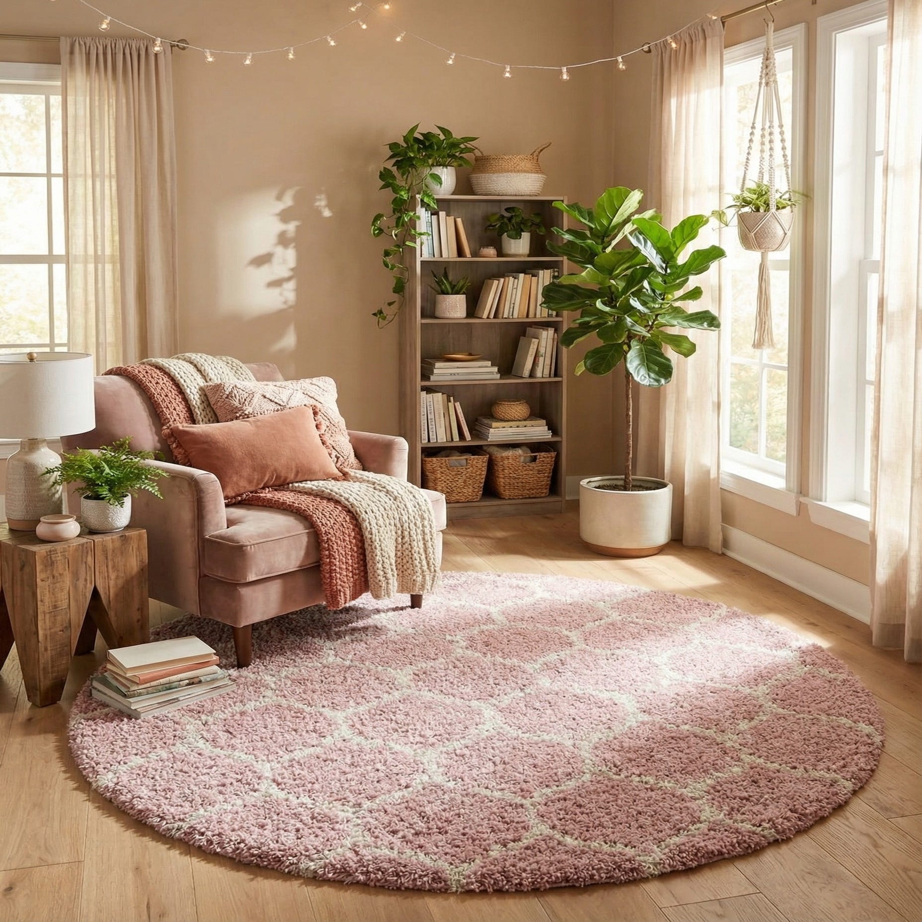 This round rug works well in a nursery or girl's bedroom, where the plush texture adds warmth and a calming color palette. It also layers nicely under a small round table or reading nook chair in a cozy living room, and pairs with light wood furniture, neutral linens, or soft metallic accents for a modern-romantic or Scandinavian-inspired scheme.