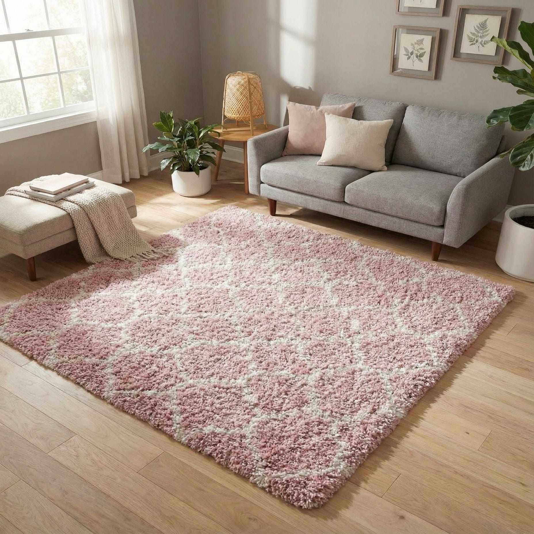 A soft, high-pile shag in a light pink ground anchors a gentle geometric pattern. Low-contrast ivory lines form a repeating lattice of rounded medallions across the surface, giving the rug a structured yet airy feel. Machine-made from 100% polypropylene, the pile feels plush and springy underfoot with a subtle sheen that catches light without overpowering the color.