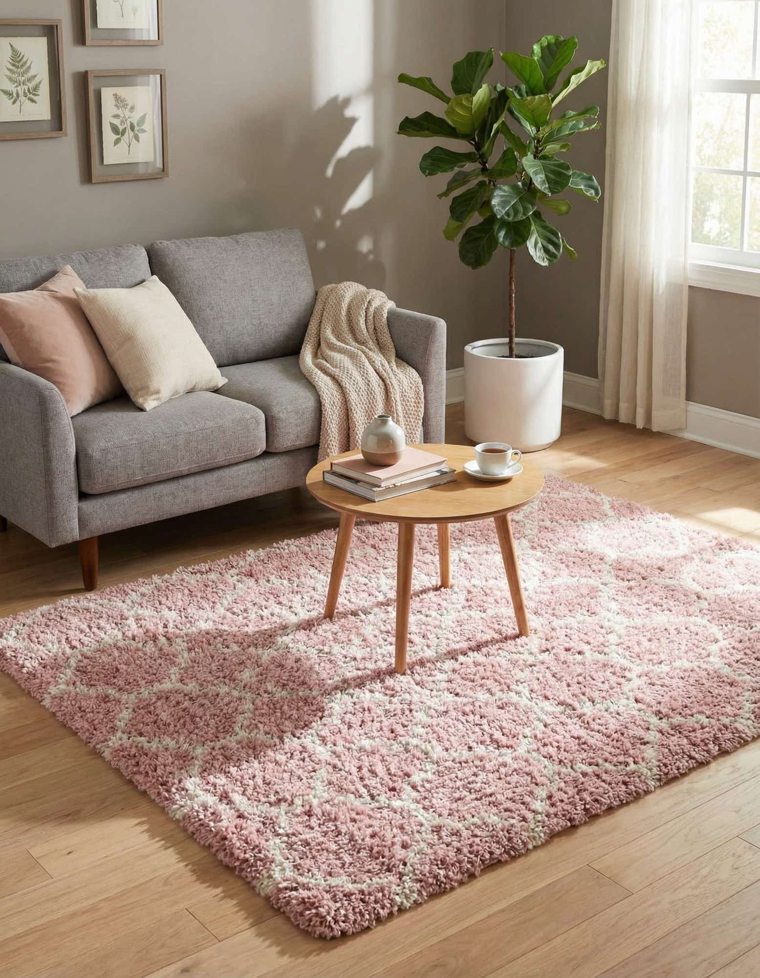 The rug works well in a nursery or child’s bedroom to bring warmth and a calm, feminine palette; it also makes a cozy layer in a small seating area or reading nook where plush texture is a priority. Pair it with white or soft gray furniture, natural wood accents, and metallic touches for a contemporary look, or use it to soften a minimalist or Scandinavian scheme.