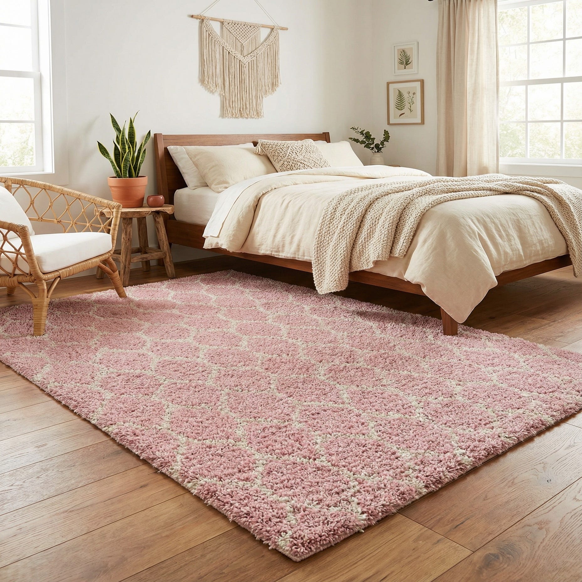 Soft, plush shag pile in a light pink field creates a warm, tactile surface that invites bare feet. An ivory lattice pattern forms a repeating, slightly raised quatrefoil motif across the rug, adding visual structure and subtle contrast without overwhelming the softness. Machine made of 100% polypropylene, the construction produces an even, dense pile with a gentle sheen that enhances the pattern and texture.