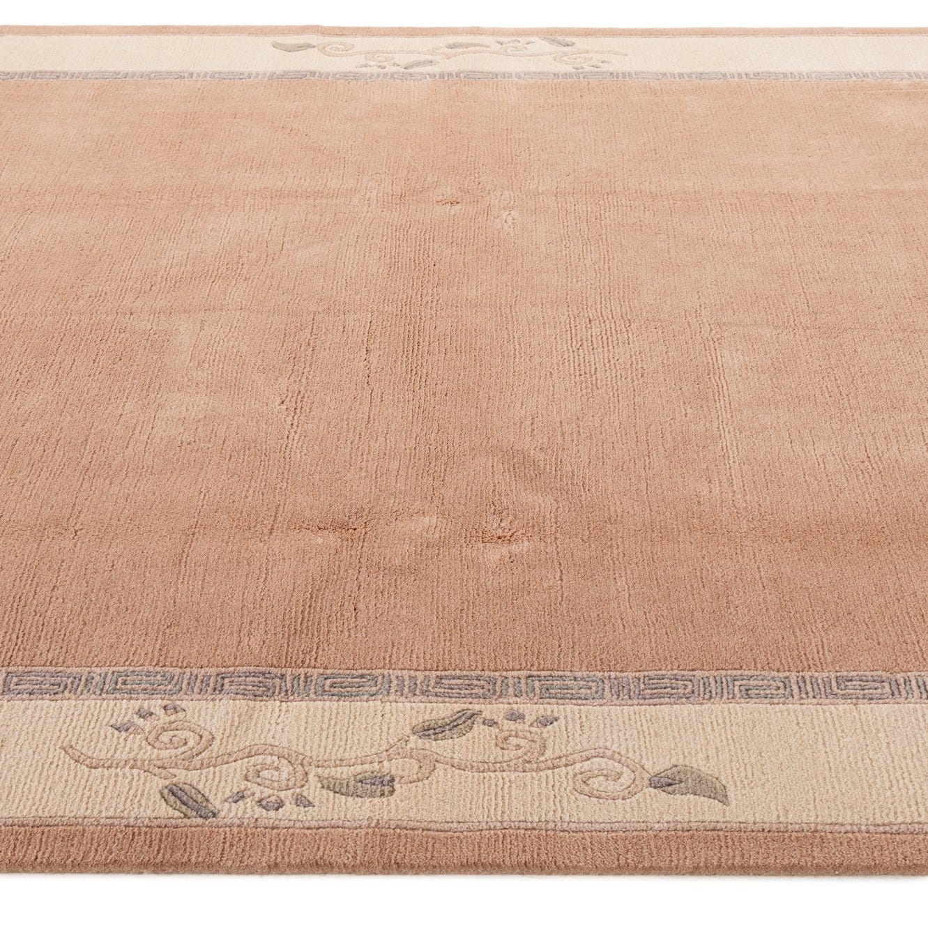 A 6x9 rectangular pink wool area rug with a cream border featuring a delicate grey leaf and vine pattern.